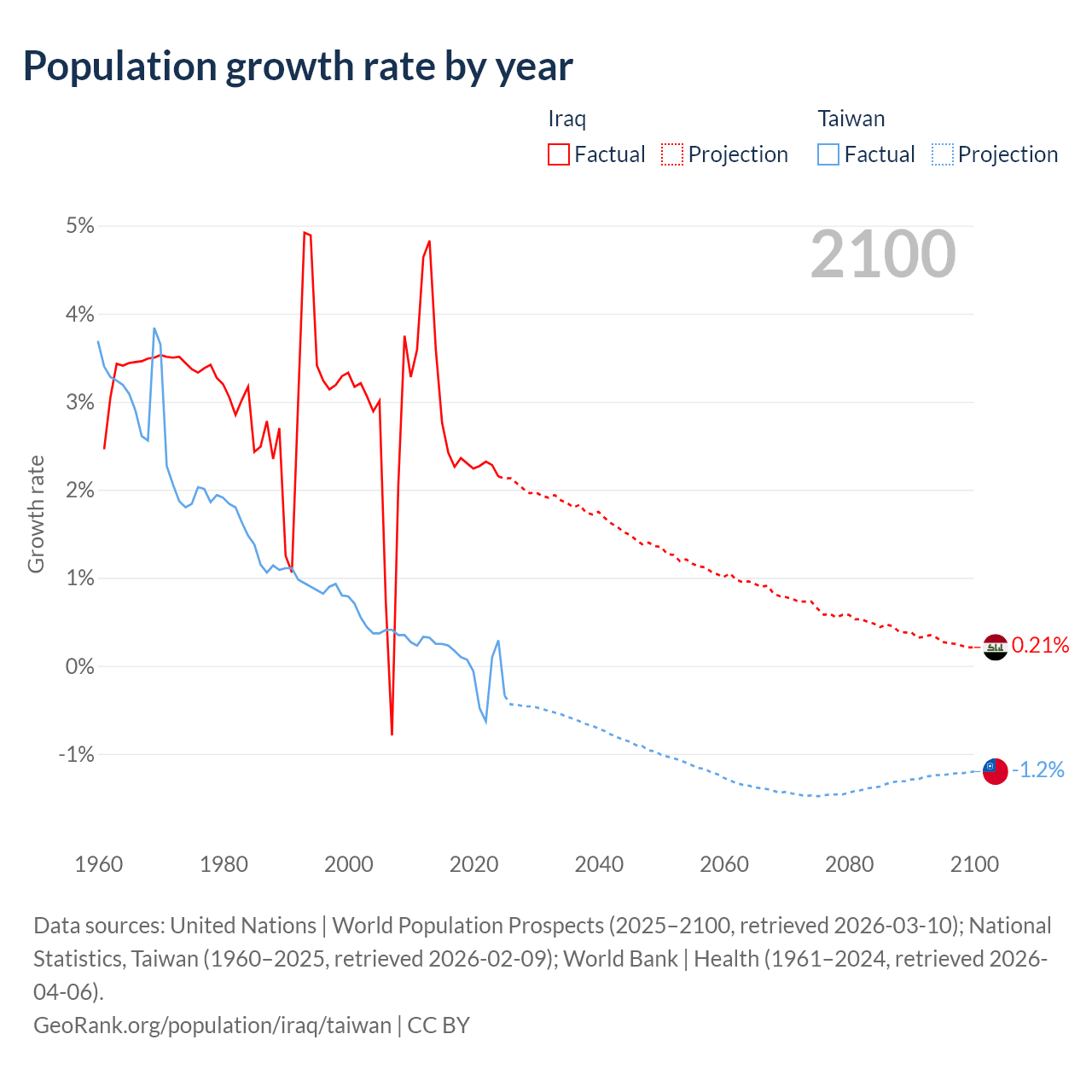- For the last 10 years, Iraq has had an average growth rate of +2.45% per year vs -0.03% in Taiwan.