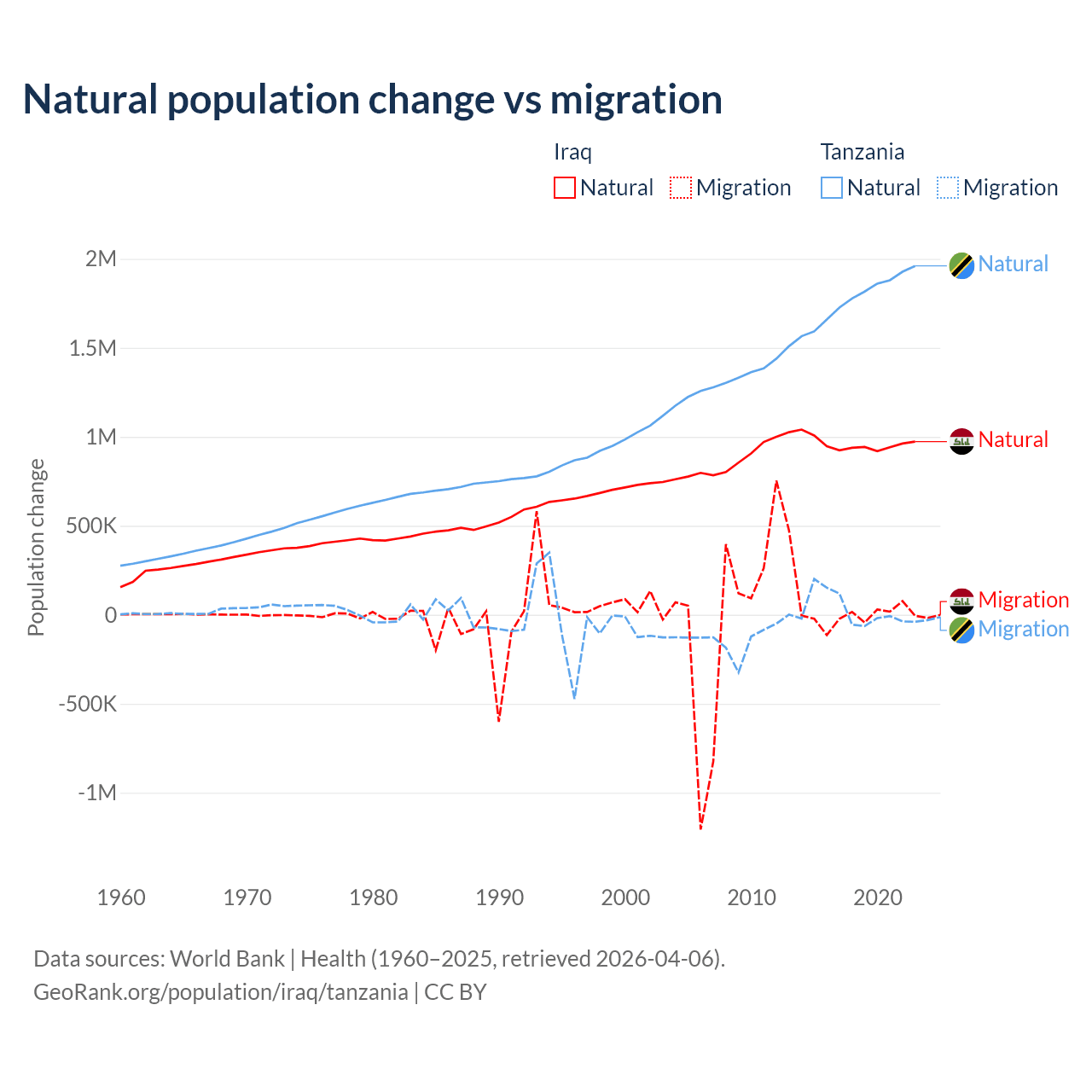 Over the last 10 years, 99.2% of the population change in Iraq is from natural causes (a gain of 9,598,842 people) and 0.76% is from migration (a loss of 73,050 people). In Tanzania 98.7% is from natural causes (a gain of 17,769,541 people) and 1.27% is from migration (a gain of 229,466 people).