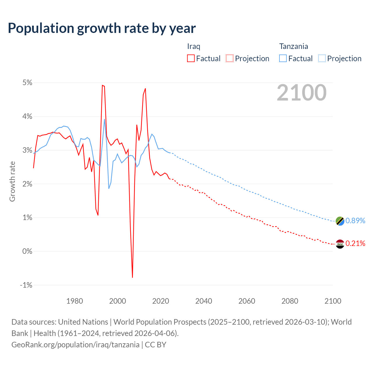 - For the last 10 years, Iraq has had an average growth rate of +2.45% per year vs +3.13% in Tanzania.