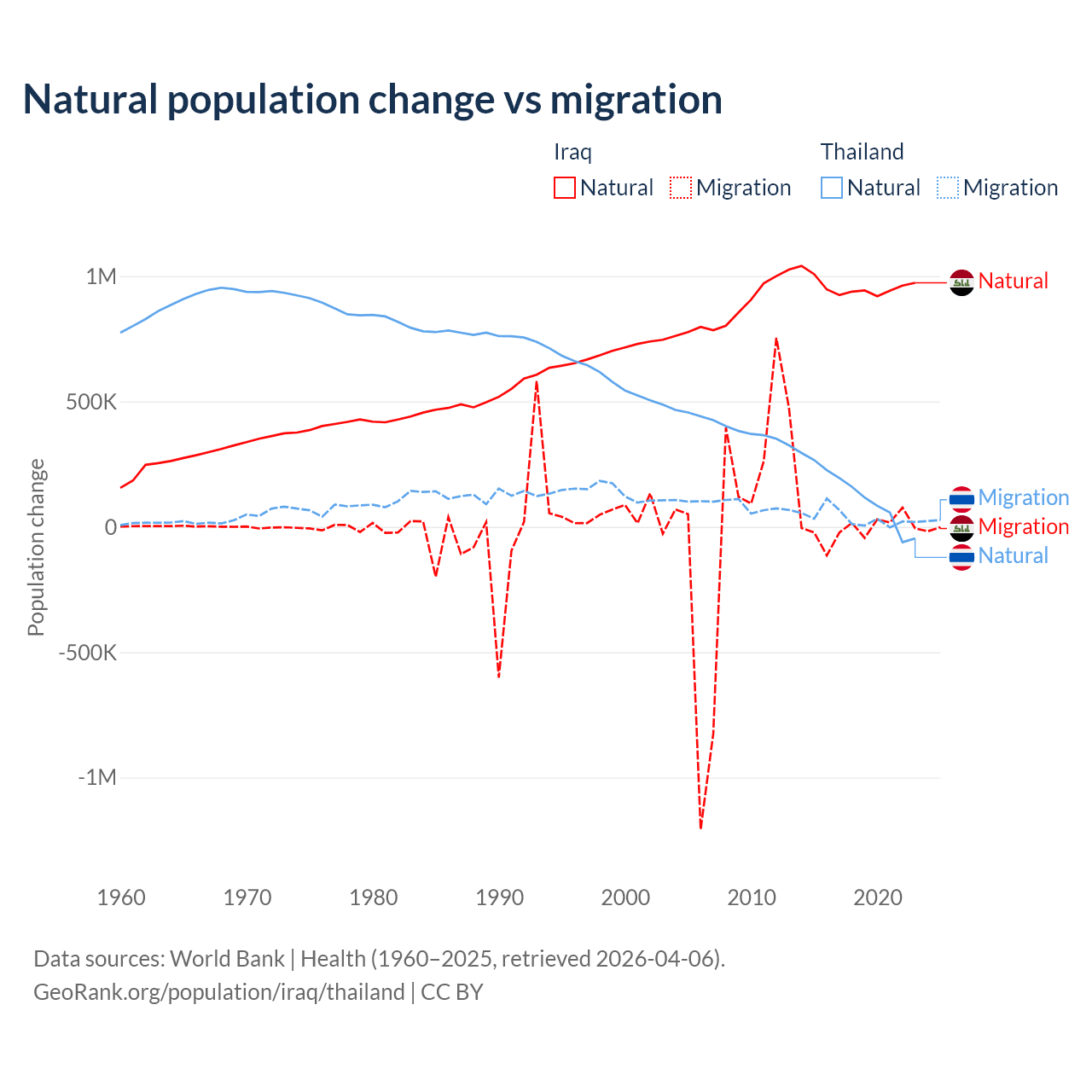 Over the last 10 years, 99.2% of the population change in Iraq is from natural causes (a gain of 9,598,842 people) and 0.76% is from migration (a loss of 73,050 people). In Thailand 78.4% is from natural causes (a gain of 1,292,528 people) and 21.6% is from migration (a gain of 355,361 people).