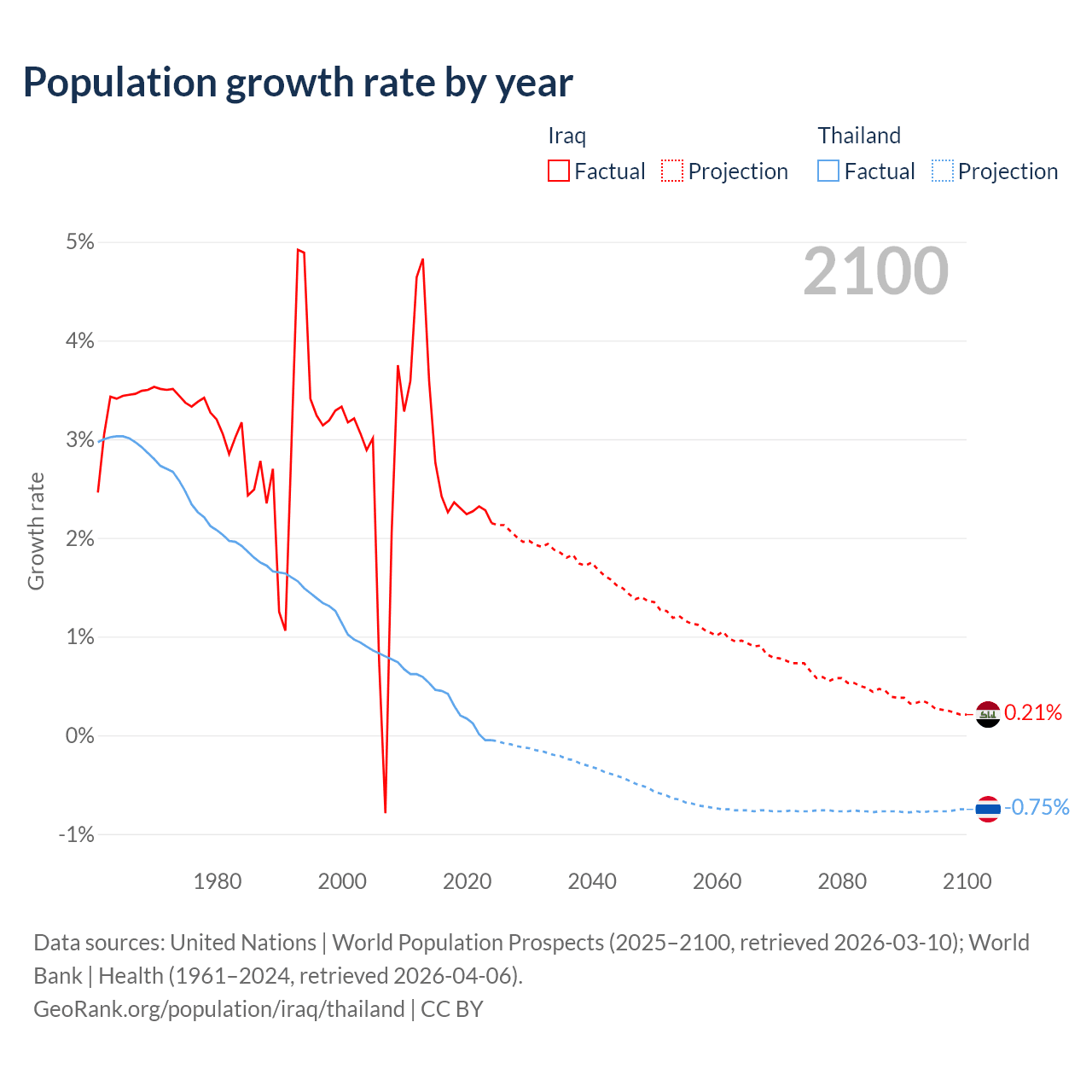 - For the last 10 years, Iraq has had an average growth rate of +2.45% per year vs +0.23% in Thailand.