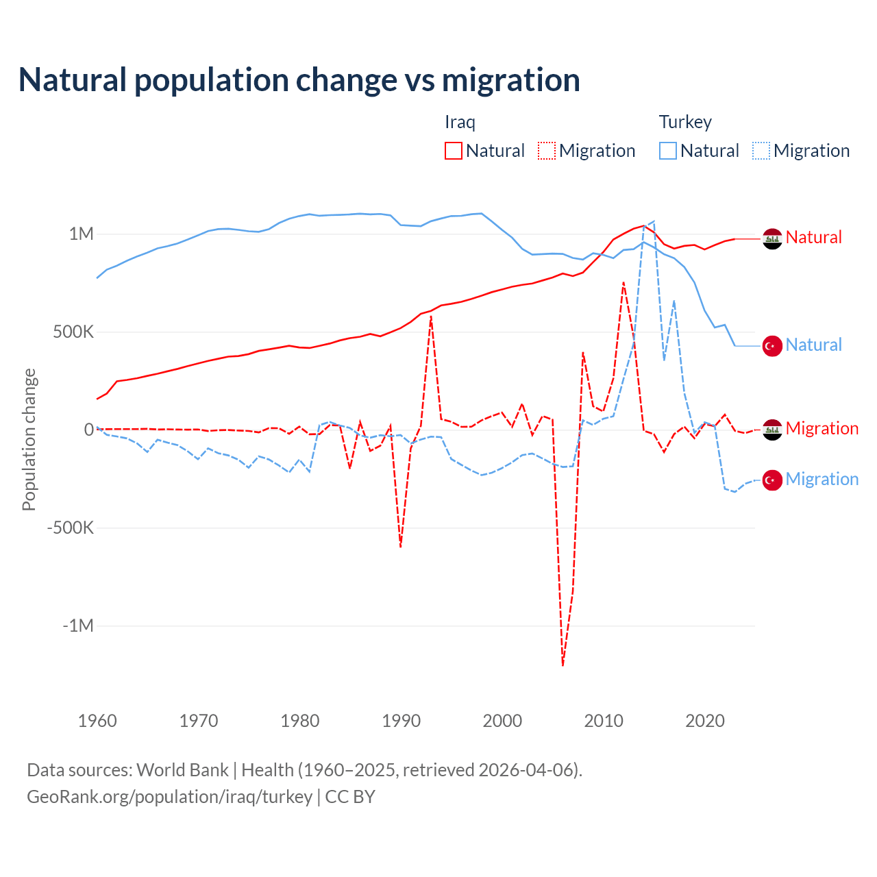 Over the last 10 years, 99.2% of the population change in Iraq is from natural causes (a gain of 9,598,842 people) and 0.76% is from migration (a loss of 73,050 people). In Turkey 73% is from natural causes (a gain of 7,333,352 people) and 27% is from migration (a gain of 2,718,916 people).
