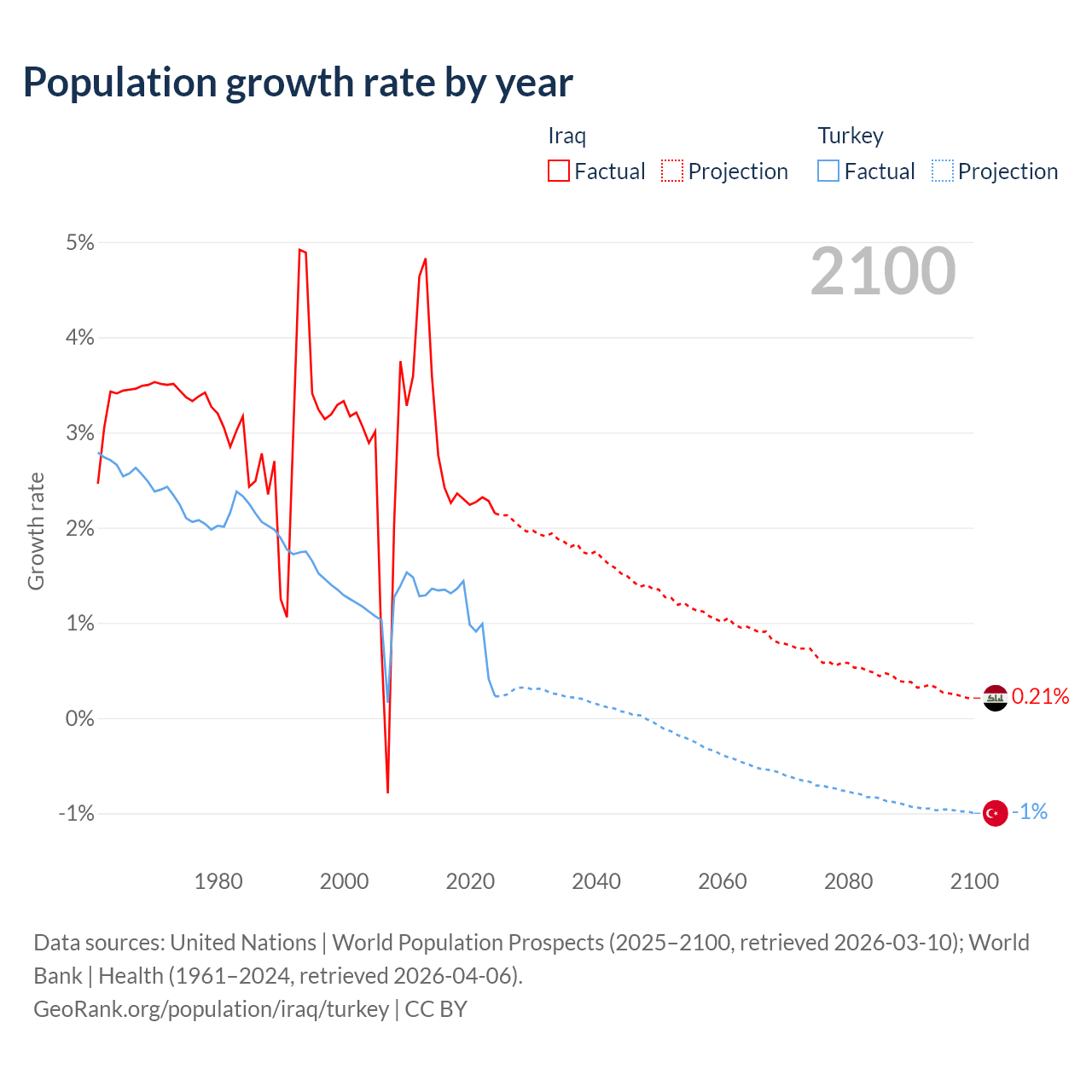 - For the last 10 years, Iraq has had an average growth rate of +2.45% per year vs +1.06% in Turkey.