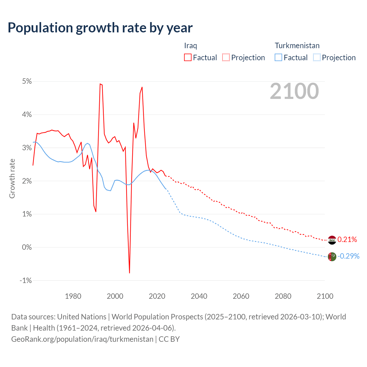 - For the last 10 years, Iraq has had an average growth rate of +2.45% per year vs +2.14% in Turkmenistan.