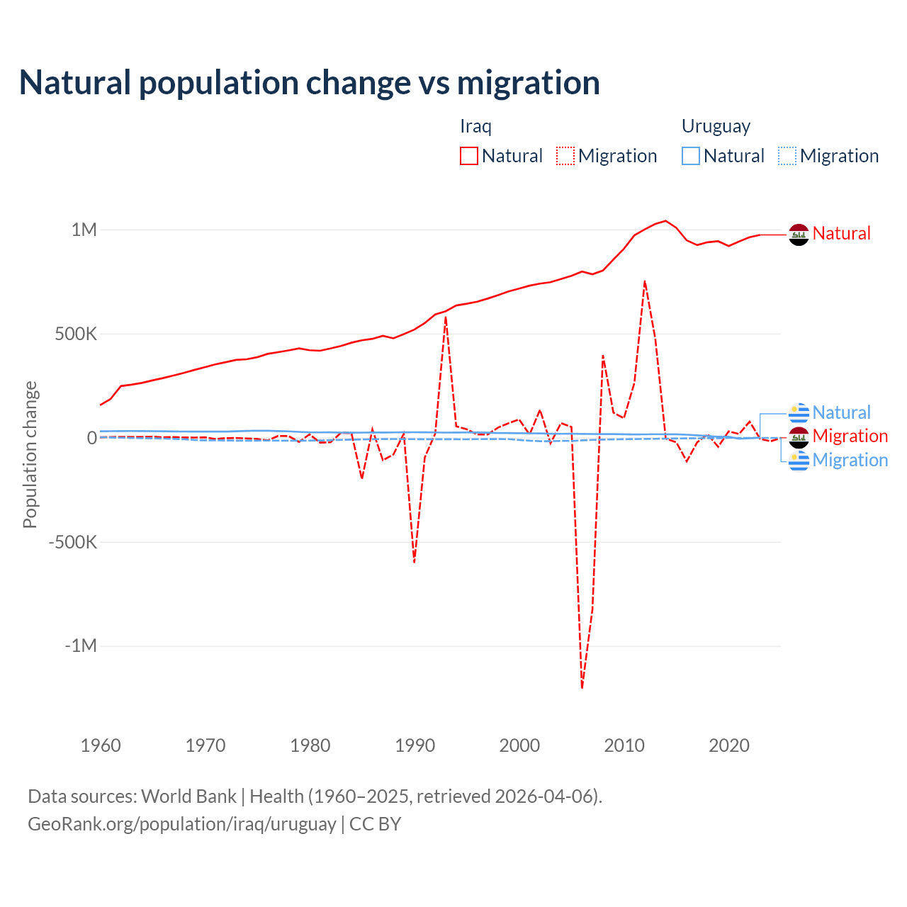 Over the last 10 years, 99.2% of the population change in Iraq is from natural causes (a gain of 9,598,842 people) and 0.76% is from migration (a loss of 73,050 people). In Uruguay 70% is from natural causes (a gain of 64,303 people) and 30% is from migration (a loss of 27,501 people).