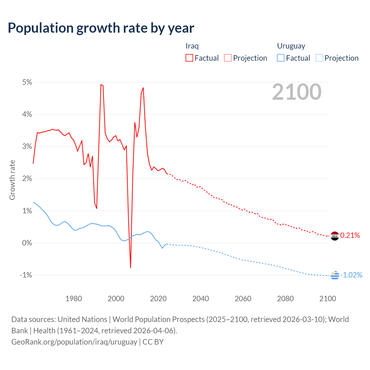 - For the last 10 years, Iraq has had an average growth rate of +2.45% per year vs +0.11% in Uruguay.