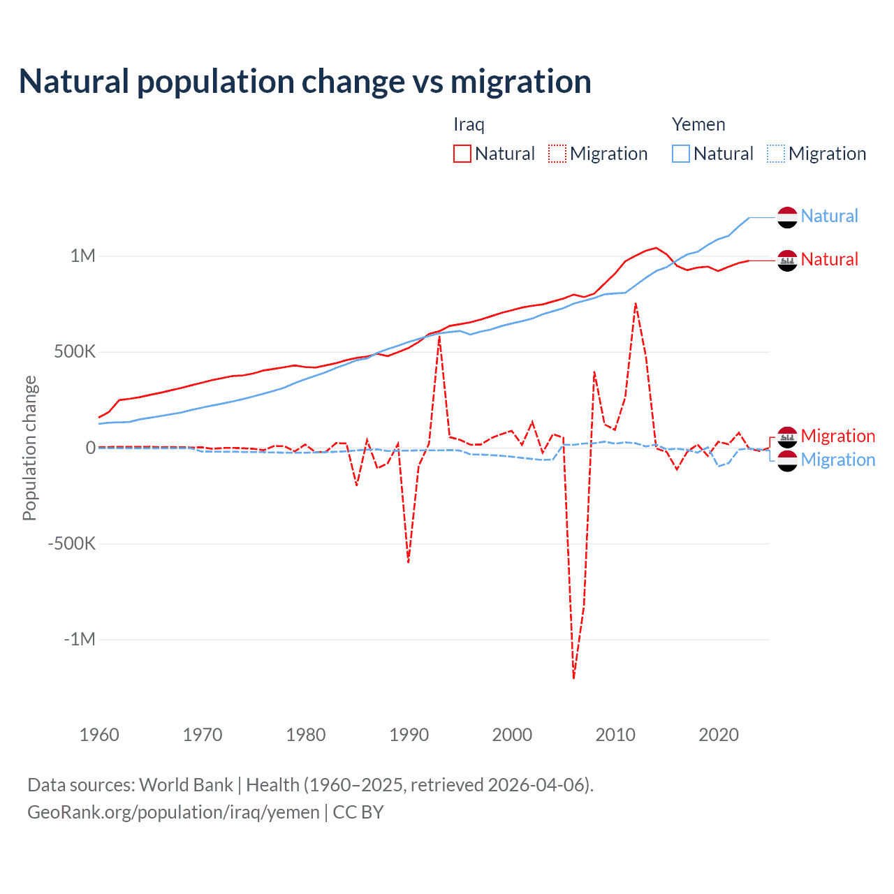Over the last 10 years, 99.2% of the population change in Iraq is from natural causes (a gain of 9,598,842 people) and 0.76% is from migration (a loss of 73,050 people). In Yemen 97.8% is from natural causes (a gain of 10,460,813 people) and 2.17% is from migration (a loss of 231,814 people).