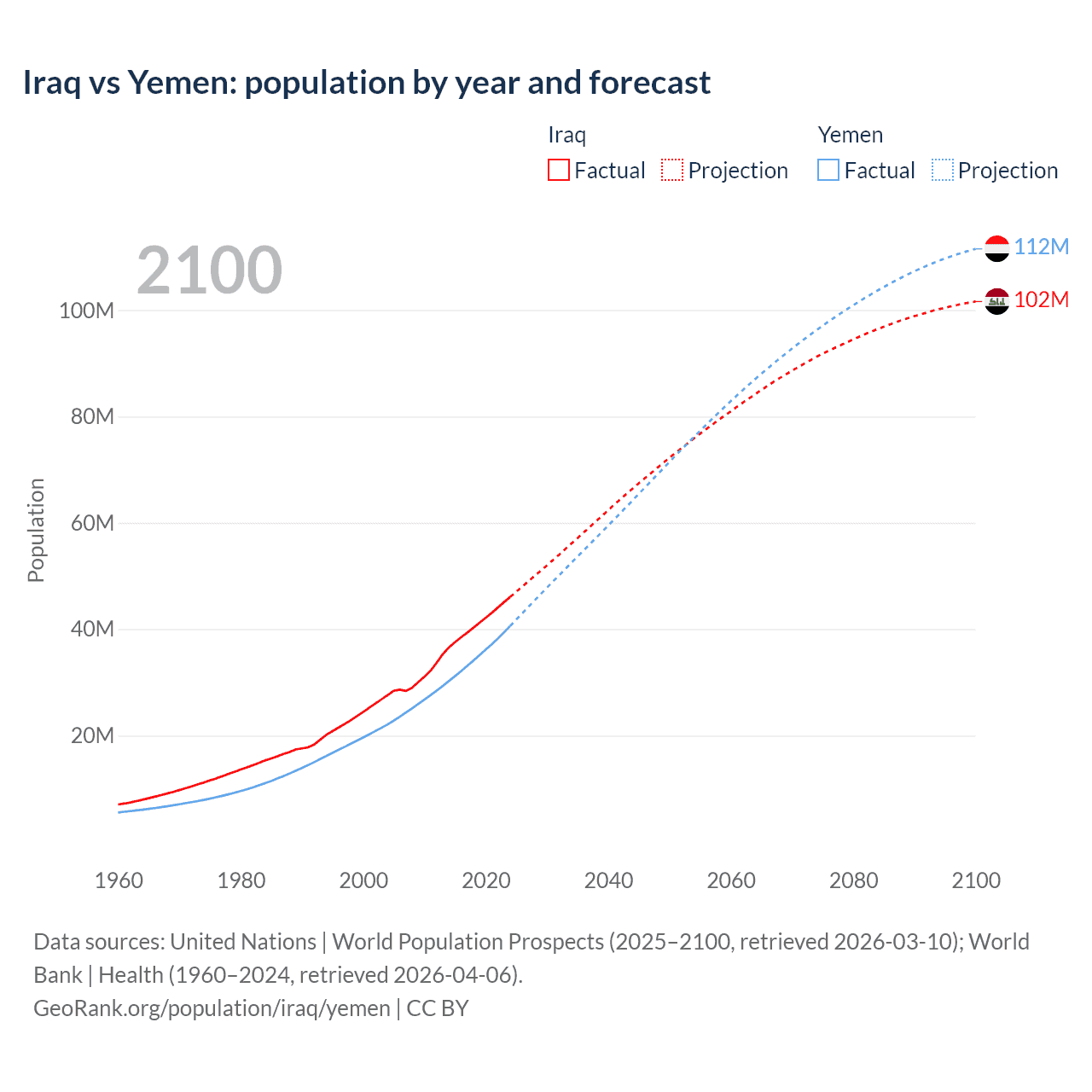 Iraq vs Yemen: population by year and forecast