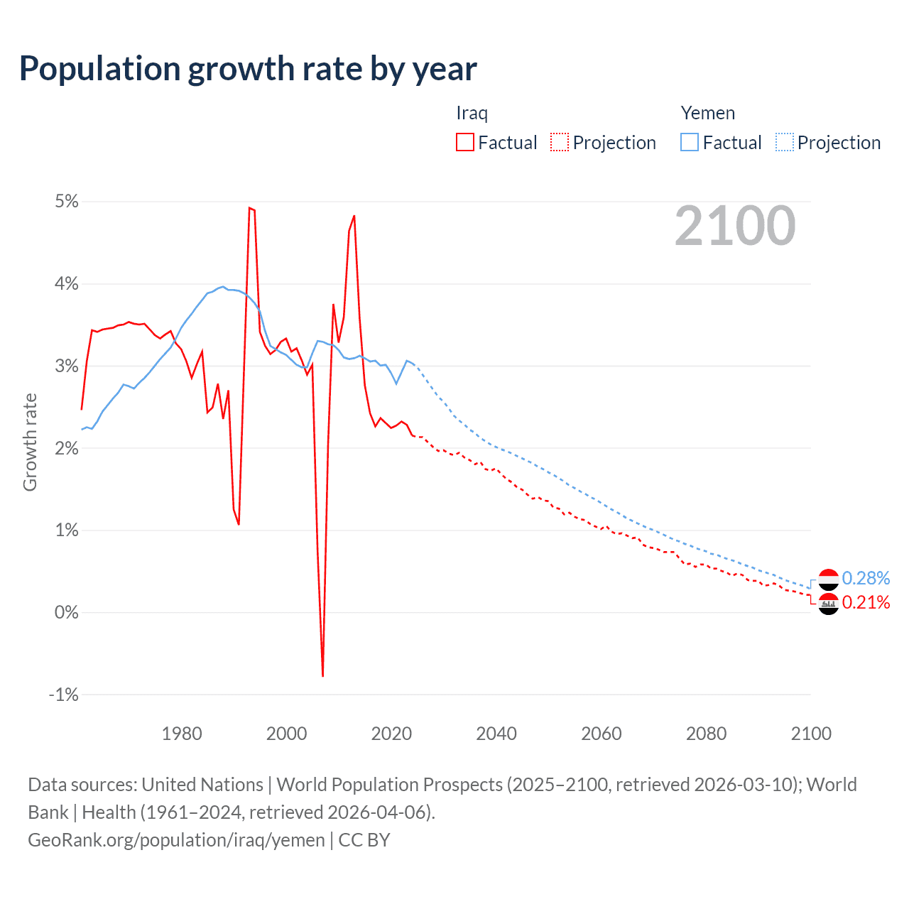 - For the last 10 years, Iraq has had an average growth rate of +2.45% per year vs +3% in Yemen.