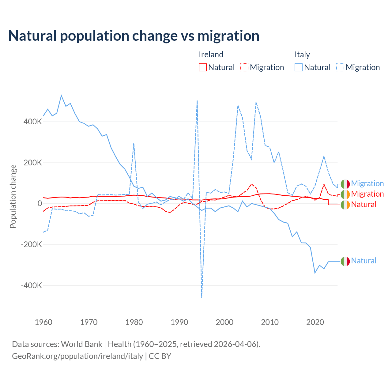 Over the last 10 years, 48.2% of the population change in Ireland is from natural causes (a gain of 284,644 people) and 51.8% is from migration (a gain of 305,297 people). In Italy 68.6% is from natural causes (a loss of 2,239,084 people) and 31.4% is from migration (a gain of 1,026,128 people).