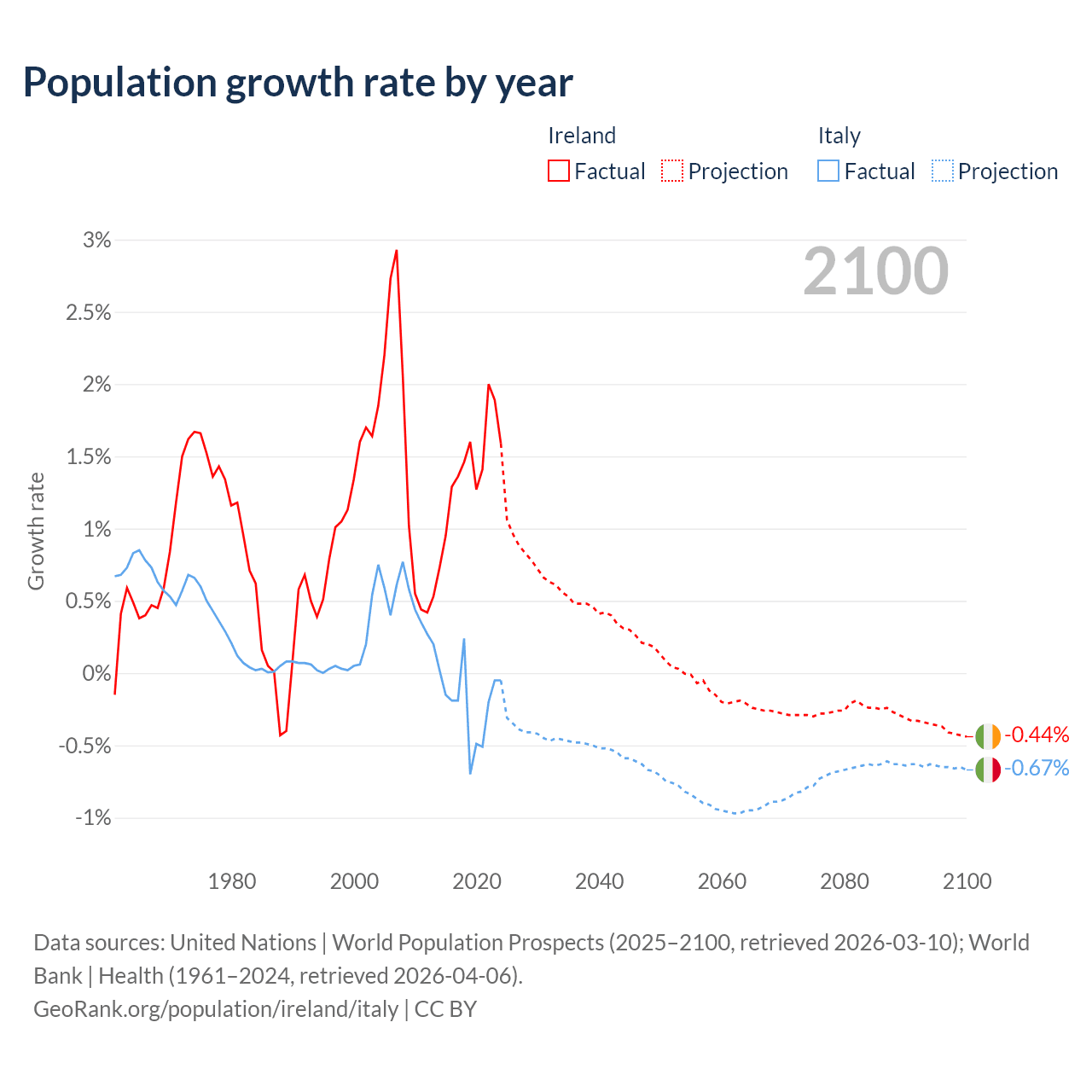- For the last 10 years, Ireland has had an average growth rate of +1.41% per year vs -0.21% in Italy.