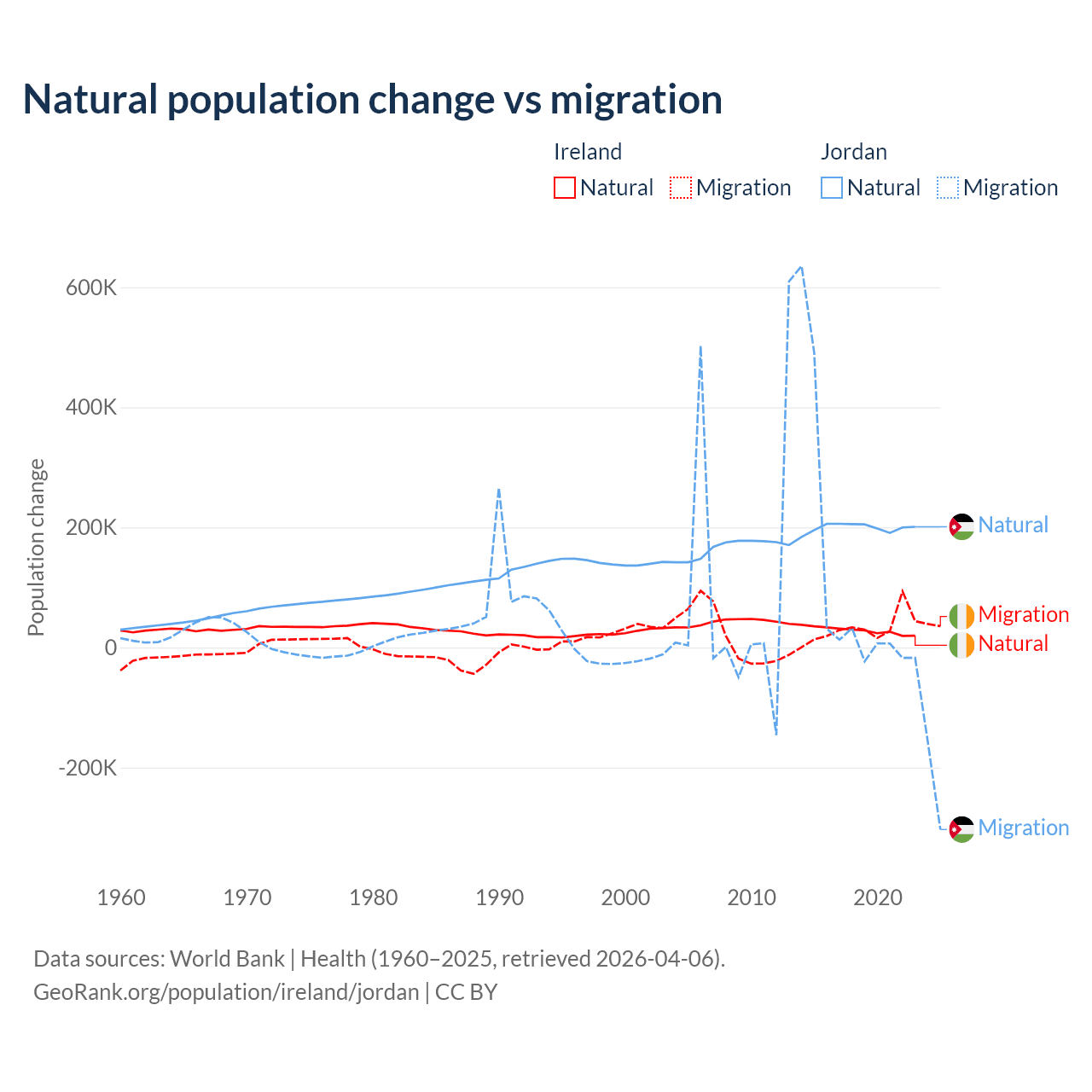 Over the last 10 years, 48.2% of the population change in Ireland is from natural causes (a gain of 284,644 people) and 51.8% is from migration (a gain of 305,297 people). In Jordan 63.2% is from natural causes (a gain of 1,991,452 people) and 36.8% is from migration (a gain of 1,157,625 people).