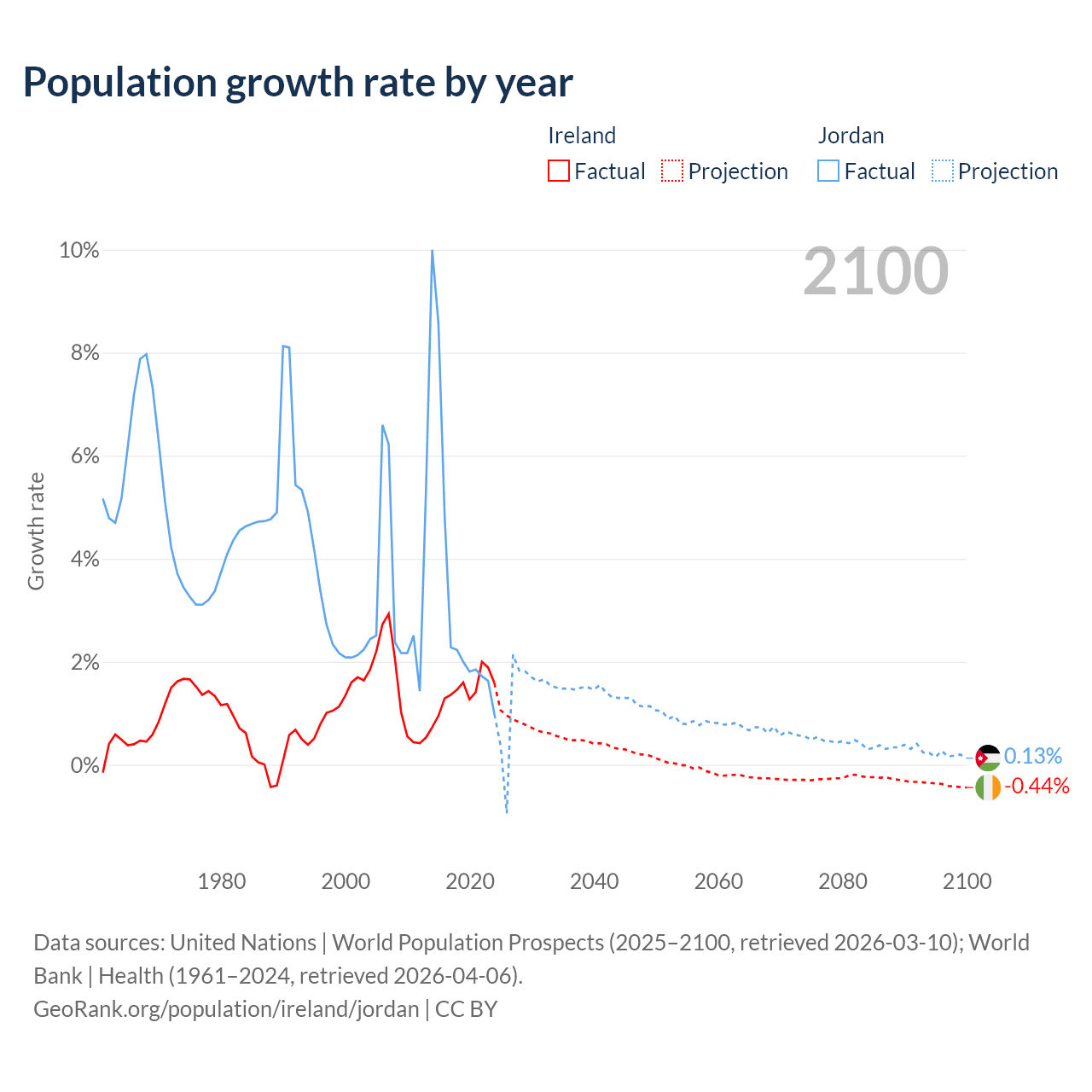 - For the last 10 years, Ireland has had an average growth rate of +1.41% per year vs +3.45% in Jordan.