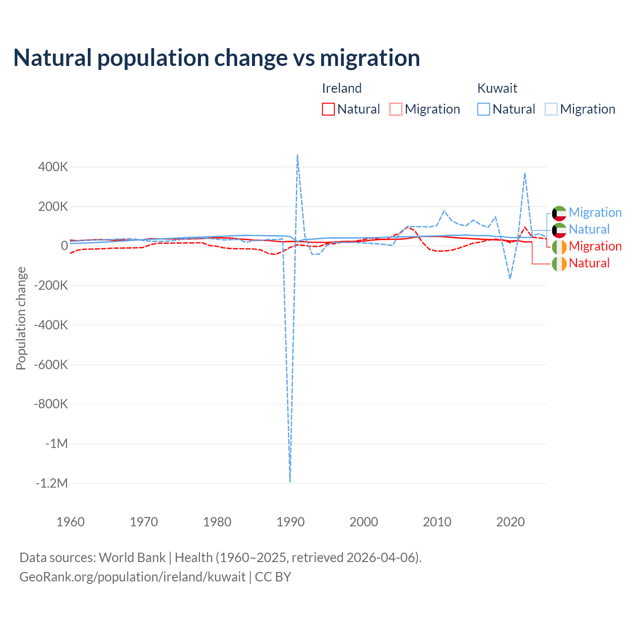 Over the last 10 years, 48.2% of the population change in Ireland is from natural causes (a gain of 284,644 people) and 51.8% is from migration (a gain of 305,297 people). In Kuwait 35.8% is from natural causes (a gain of 470,645 people) and 64.2% is from migration (a gain of 845,142 people).