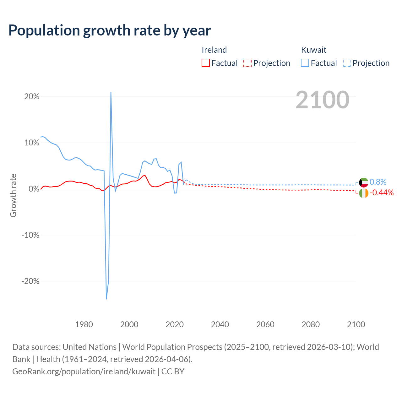 - For the last 10 years, Ireland has had an average growth rate of +1.41% per year vs +3.1% in Kuwait.