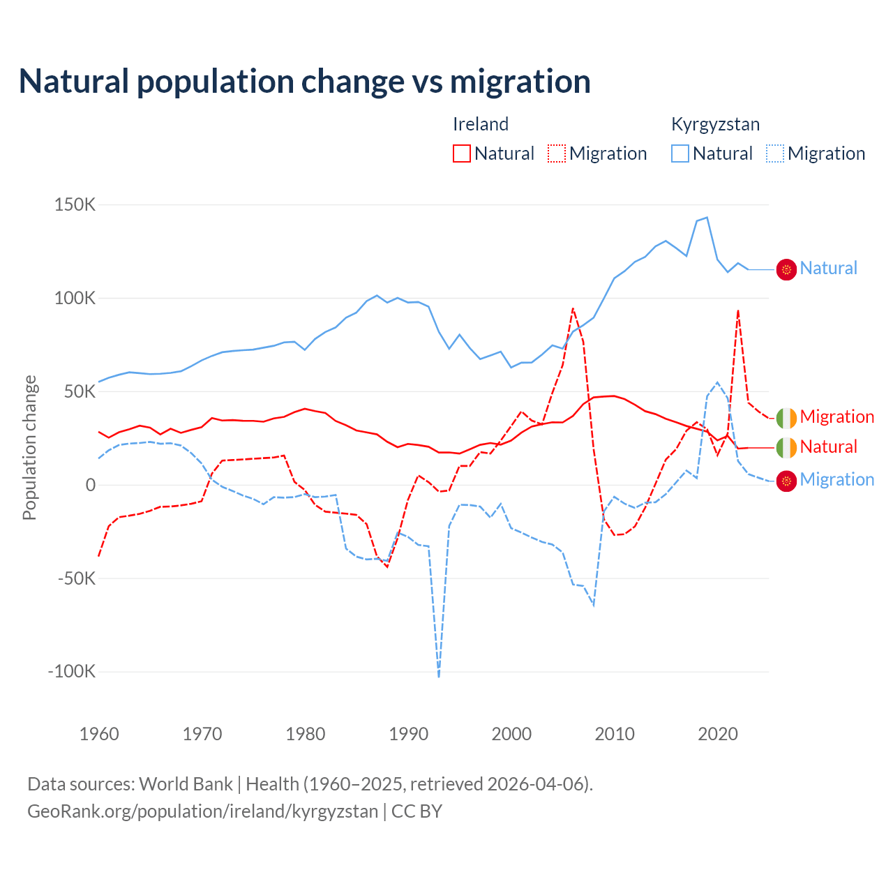 Over the last 10 years, 48.2% of the population change in Ireland is from natural causes (a gain of 284,644 people) and 51.8% is from migration (a gain of 305,297 people). In Kyrgyzstan 88.5% is from natural causes (a gain of 1,258,837 people) and 11.5% is from migration (a gain of 164,132 people).