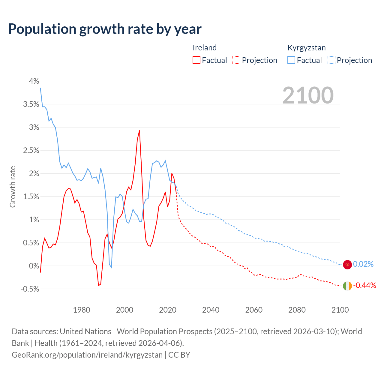- For the last 10 years, Ireland has had an average growth rate of +1.41% per year vs +2.05% in Kyrgyzstan.