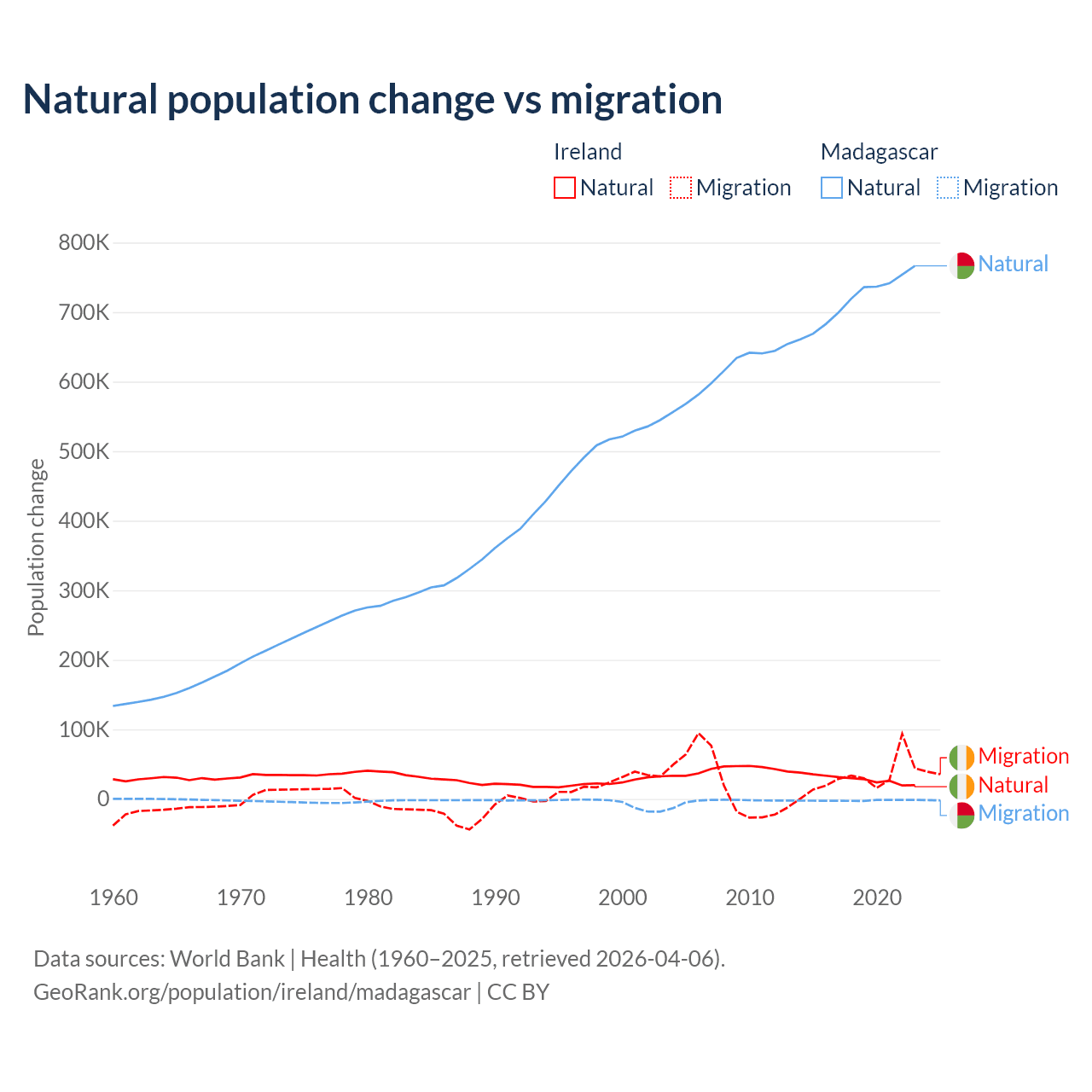 Over the last 10 years, 48.2% of the population change in Ireland is from natural causes (a gain of 284,644 people) and 51.8% is from migration (a gain of 305,297 people). In Madagascar 99.7% is from natural causes (a gain of 7,165,578 people) and 0.31% is from migration (a loss of 22,384 people).