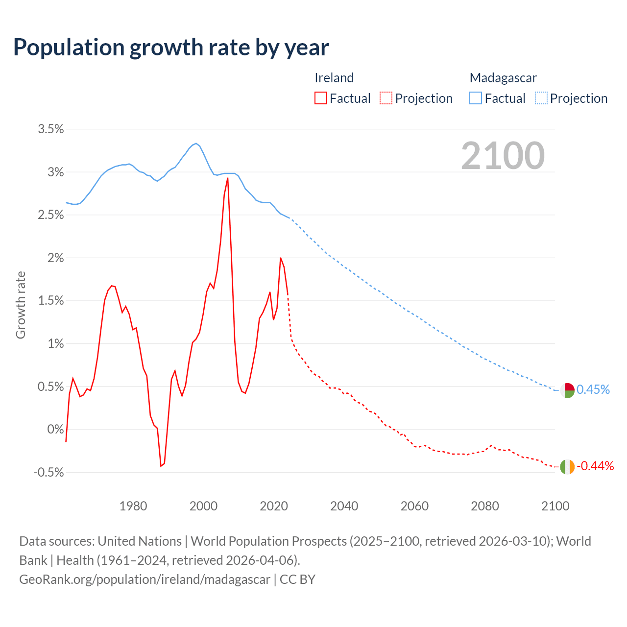 - For the last 10 years, Ireland has had an average growth rate of +1.41% per year vs +2.6% in Madagascar.