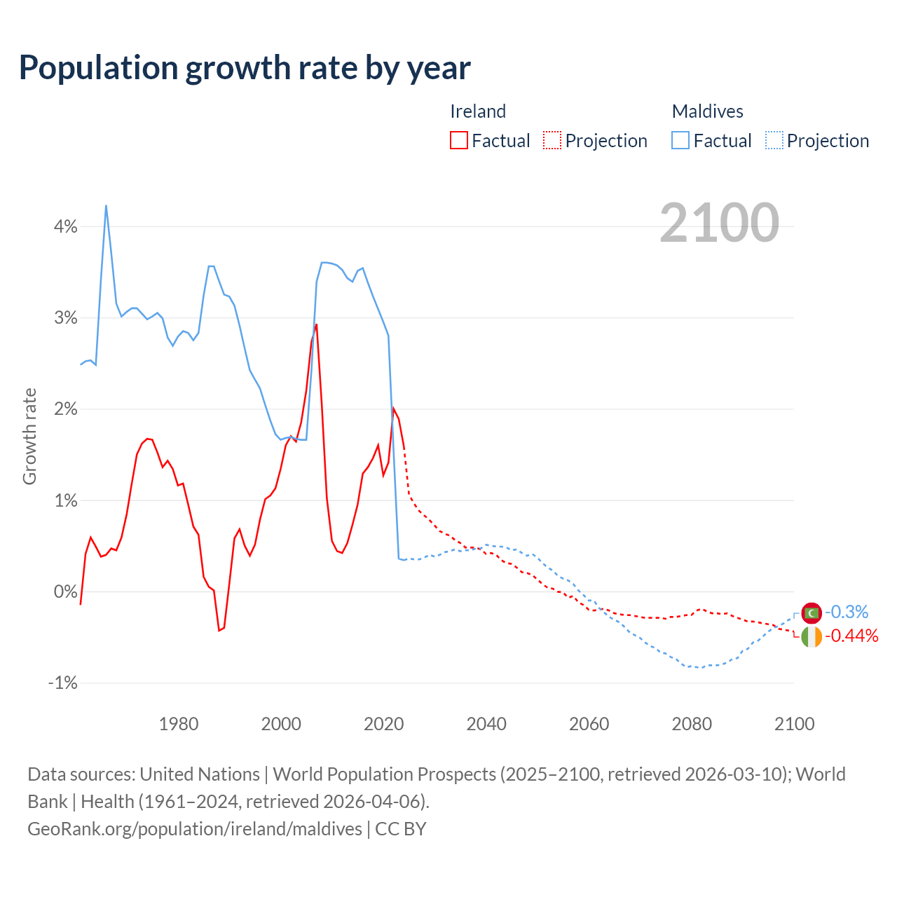- For the last 10 years, Ireland has had an average growth rate of +1.41% per year vs +2.56% in Maldives.