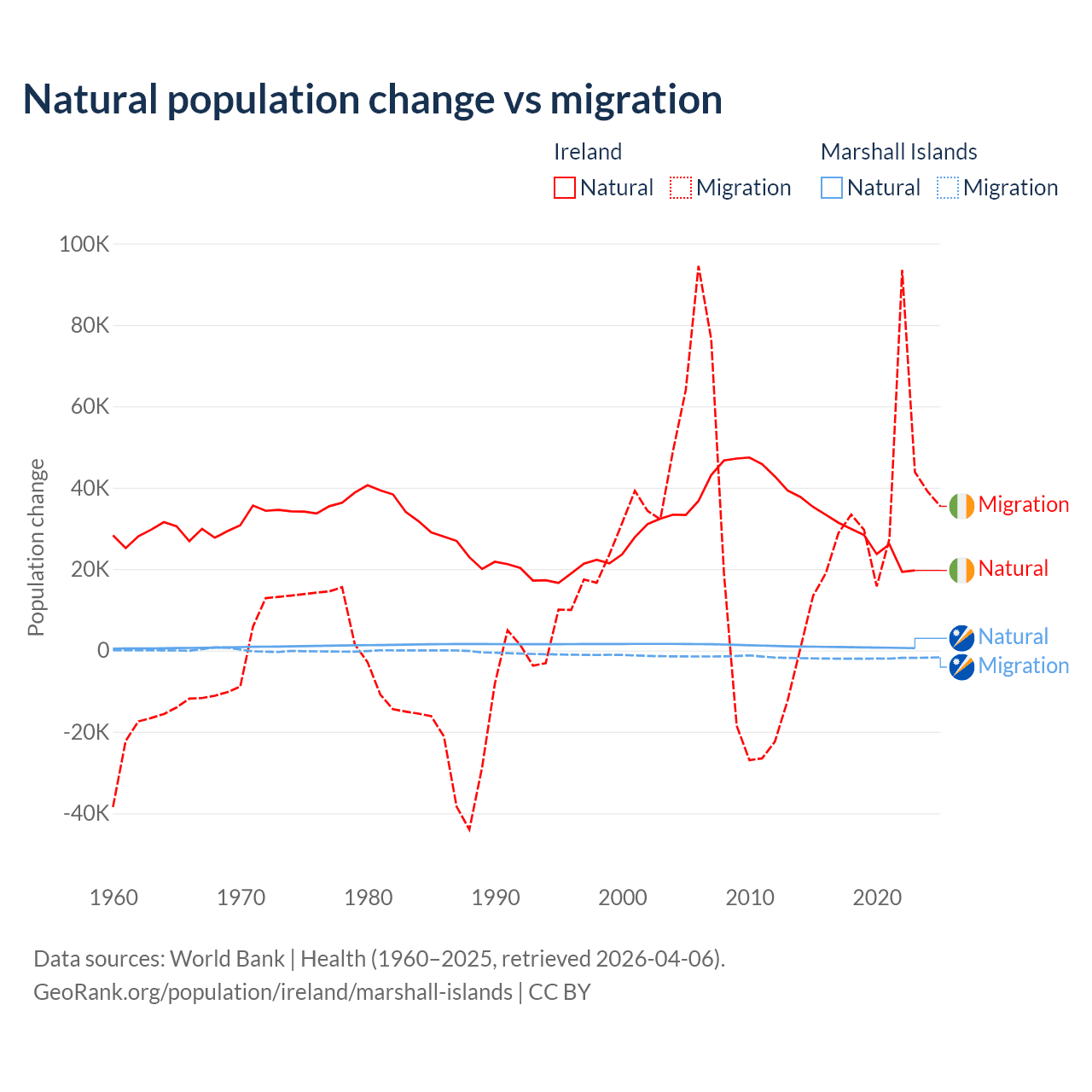 Over the last 10 years, 48.2% of the population change in Ireland is from natural causes (a gain of 284,644 people) and 51.8% is from migration (a gain of 305,297 people). In the Marshall Islands 27.8% is from natural causes (a gain of 7,592 people) and 72.2% is from migration (a loss of 19,682 people).