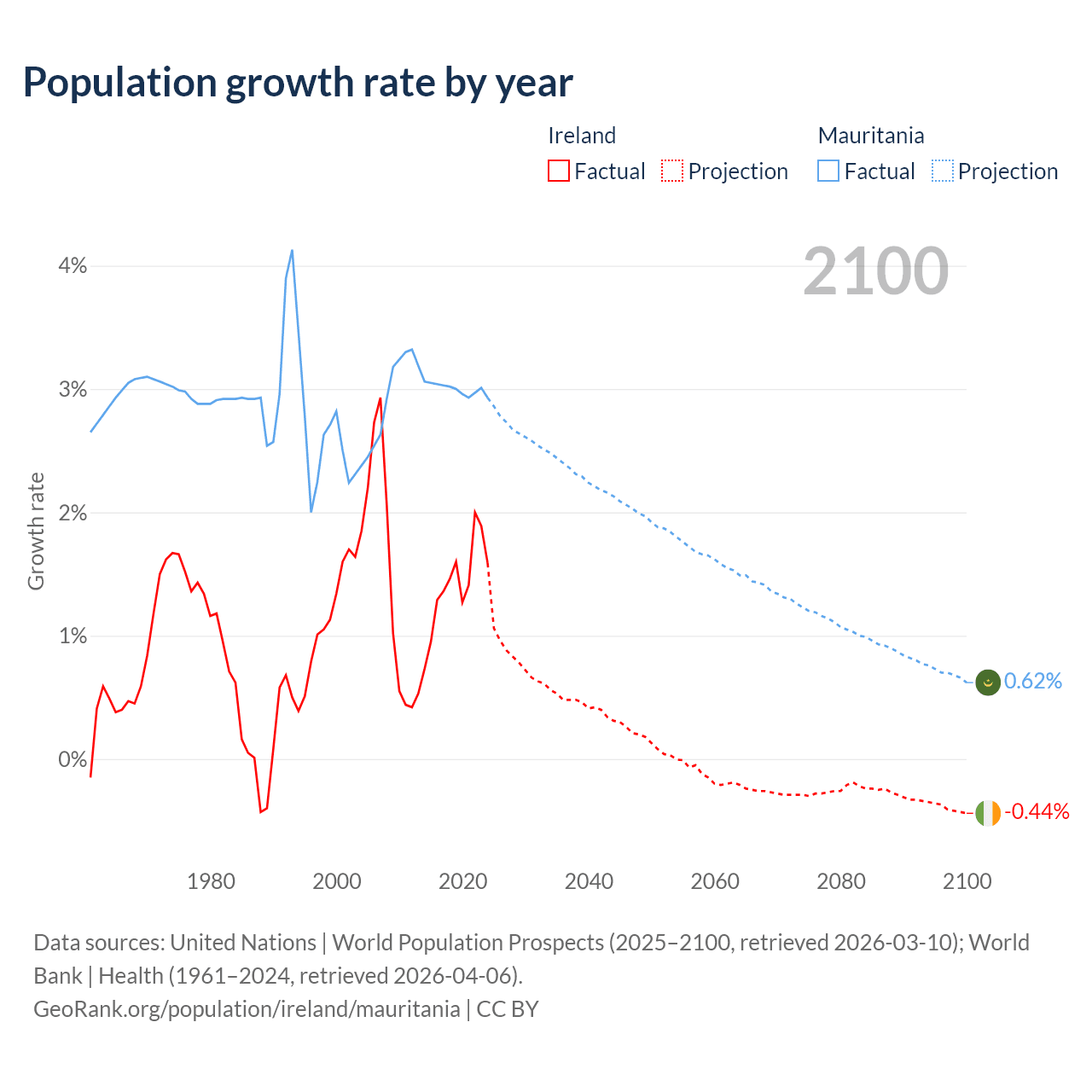 - For the last 10 years, Ireland has had an average growth rate of +1.41% per year vs +3% in Mauritania.