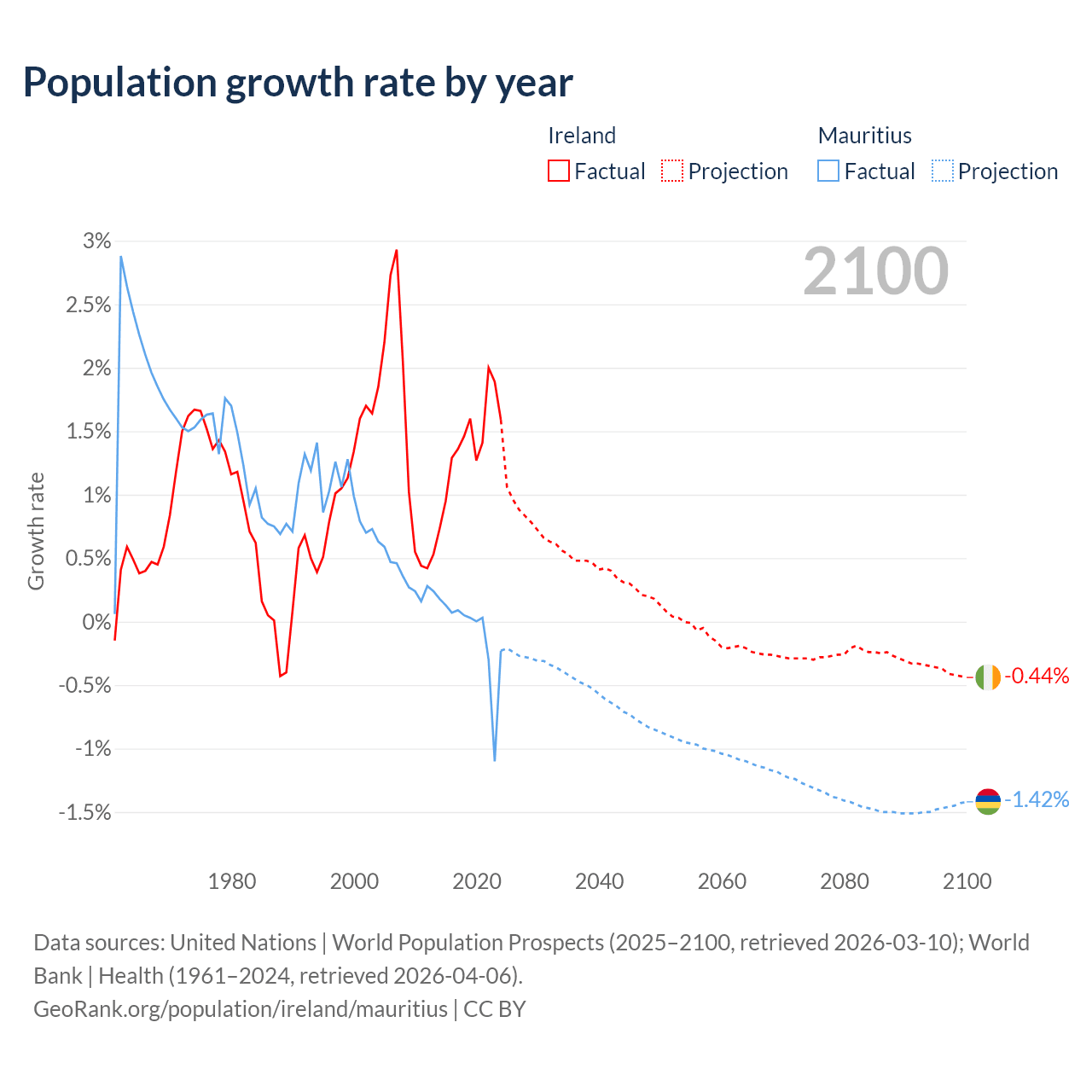 - For the last 10 years, Ireland has had an average growth rate of +1.41% per year vs -0.09% in Mauritius.
