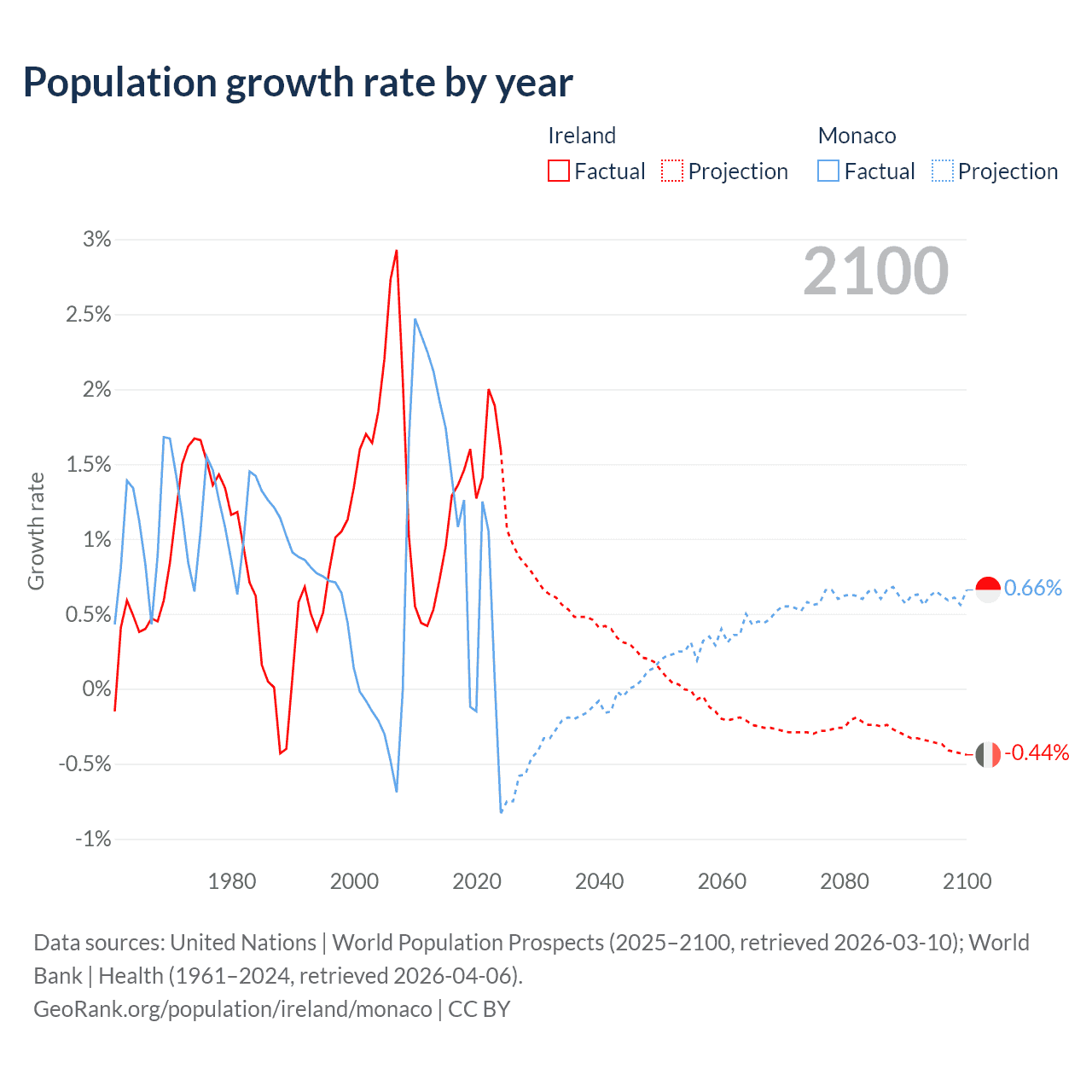 - For the last 10 years, Ireland has had an average growth rate of +1.41% per year vs +0.79% in Monaco.