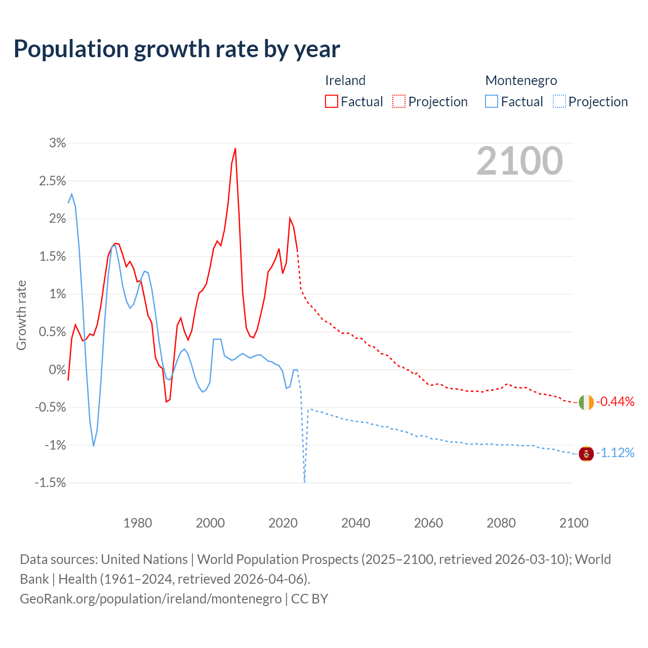 - For the last 10 years, Ireland has had an average growth rate of +1.41% per year vs +0.01% in Montenegro.