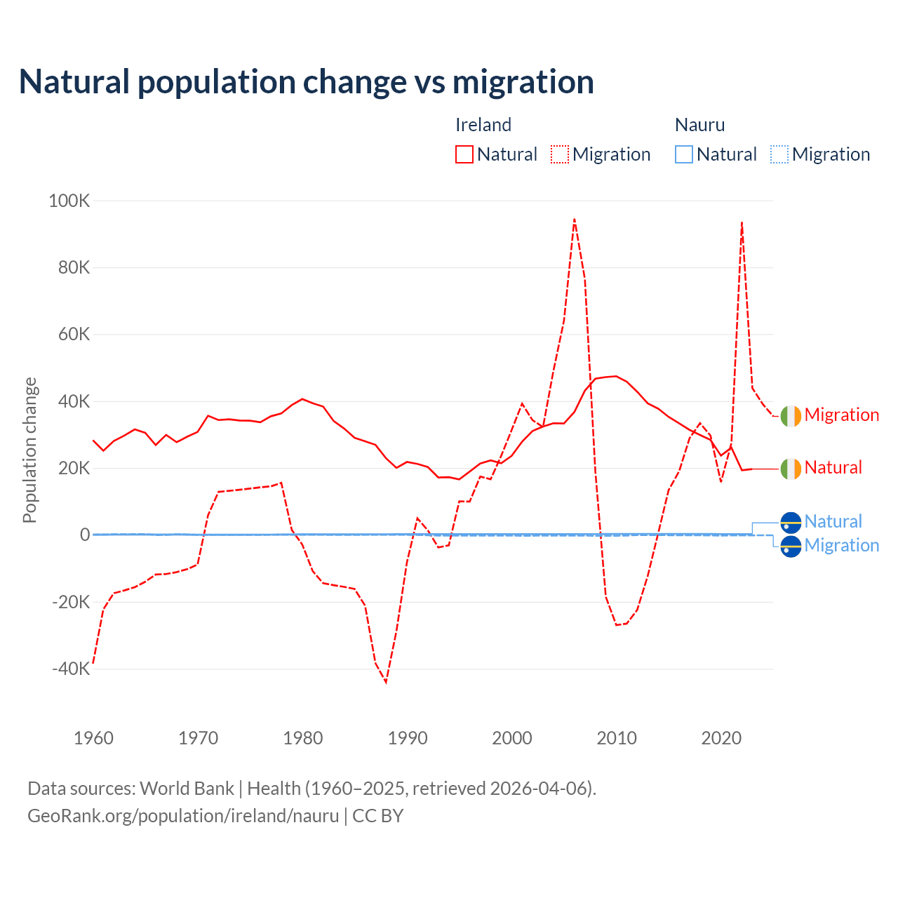 Over the last 10 years, 48.2% of the population change in Ireland is from natural causes (a gain of 284,644 people) and 51.8% is from migration (a gain of 305,297 people). In Nauru 66.2% is from natural causes (a gain of 2,590 people) and 33.8% is from migration (a loss of 1,320 people).