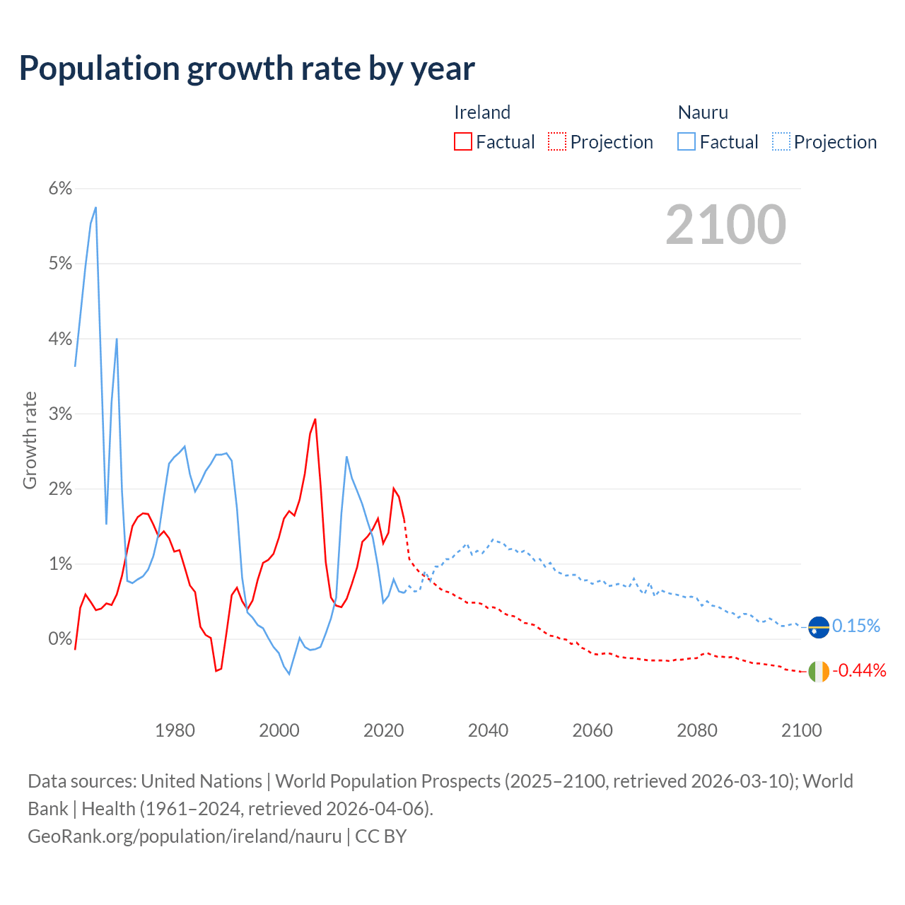 - For the last 10 years, Ireland has had an average growth rate of +1.41% per year vs +1.17% in Nauru.