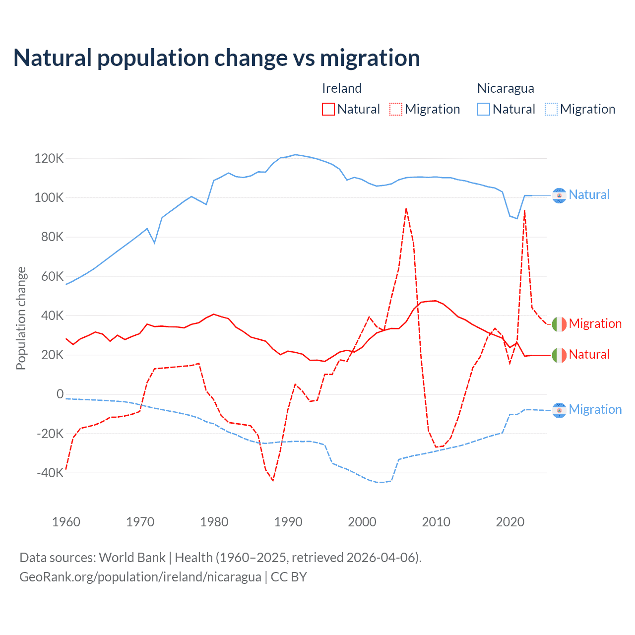 Over the last 10 years, 48.2% of the population change in Ireland is from natural causes (a gain of 284,644 people) and 51.8% is from migration (a gain of 305,297 people). In Nicaragua 85.5% is from natural causes (a gain of 1,017,084 people) and 14.5% is from migration (a loss of 172,078 people).