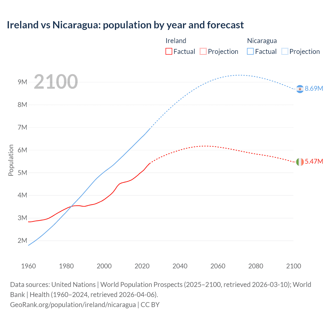 Ireland vs Nicaragua: population by year and forecast