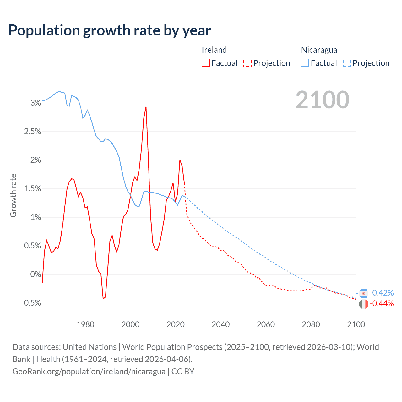 - For the last 10 years, Ireland has had an average growth rate of +1.41% per year vs +1.33% in Nicaragua.