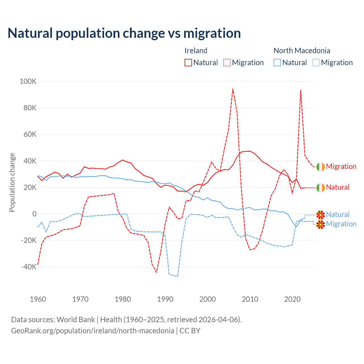 Over the last 10 years, 48.2% of the population change in Ireland is from natural causes (a gain of 284,644 people) and 51.8% is from migration (a gain of 305,297 people). In North Macedonia 6.45% is from natural causes (a loss of 12,585 people) and 93.5% is from migration (a loss of 182,429 people).