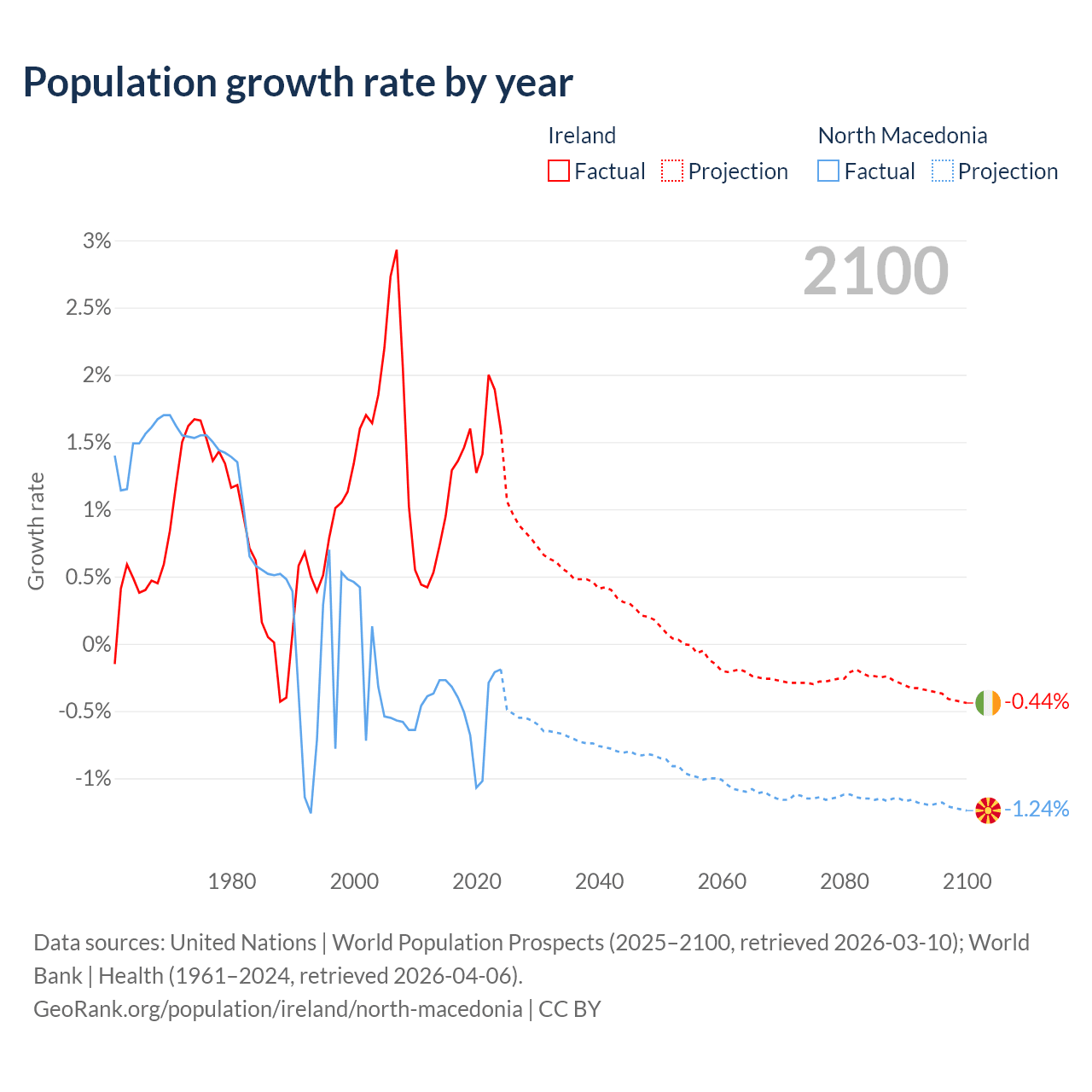 - For the last 10 years, Ireland has had an average growth rate of +1.41% per year vs -0.48% in North Macedonia.