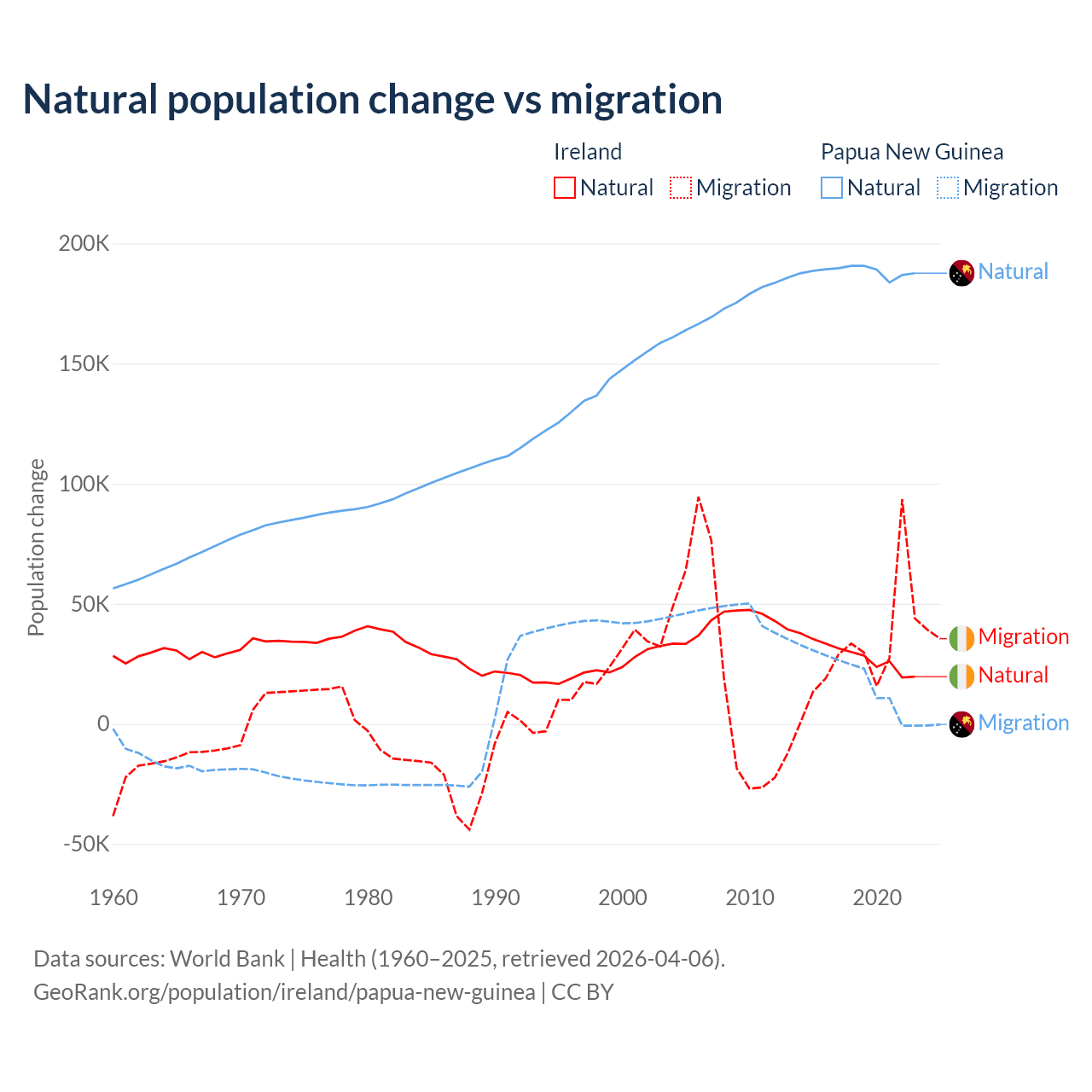 Over the last 10 years, 48.2% of the population change in Ireland is from natural causes (a gain of 284,644 people) and 51.8% is from migration (a gain of 305,297 people). In Papua New Guinea 91% is from natural causes (a gain of 1,883,906 people) and 8.98% is from migration (a gain of 185,900 people).