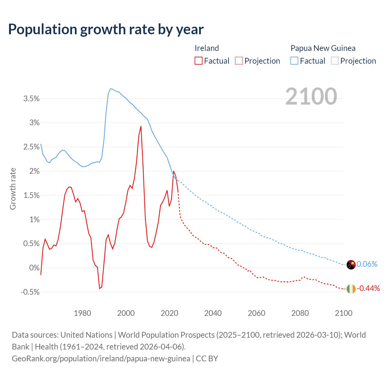 - For the last 10 years, Ireland has had an average growth rate of +1.41% per year vs +2.23% in Papua New Guinea.