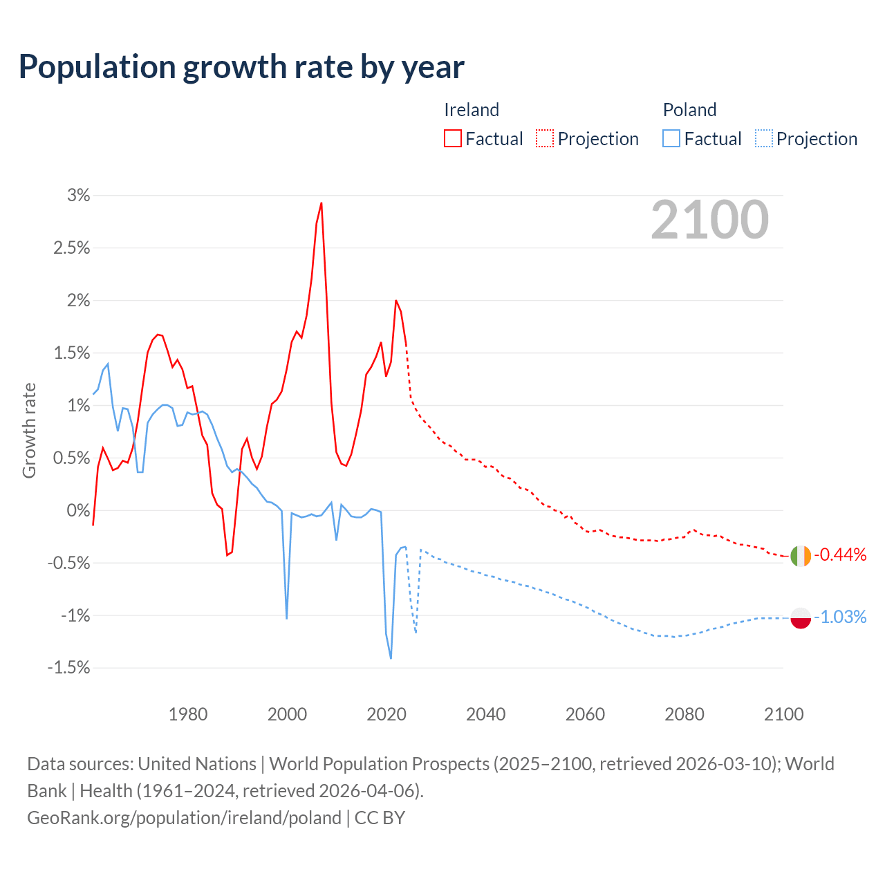 - For the last 10 years, Ireland has had an average growth rate of +1.41% per year vs -0.36% in Poland.