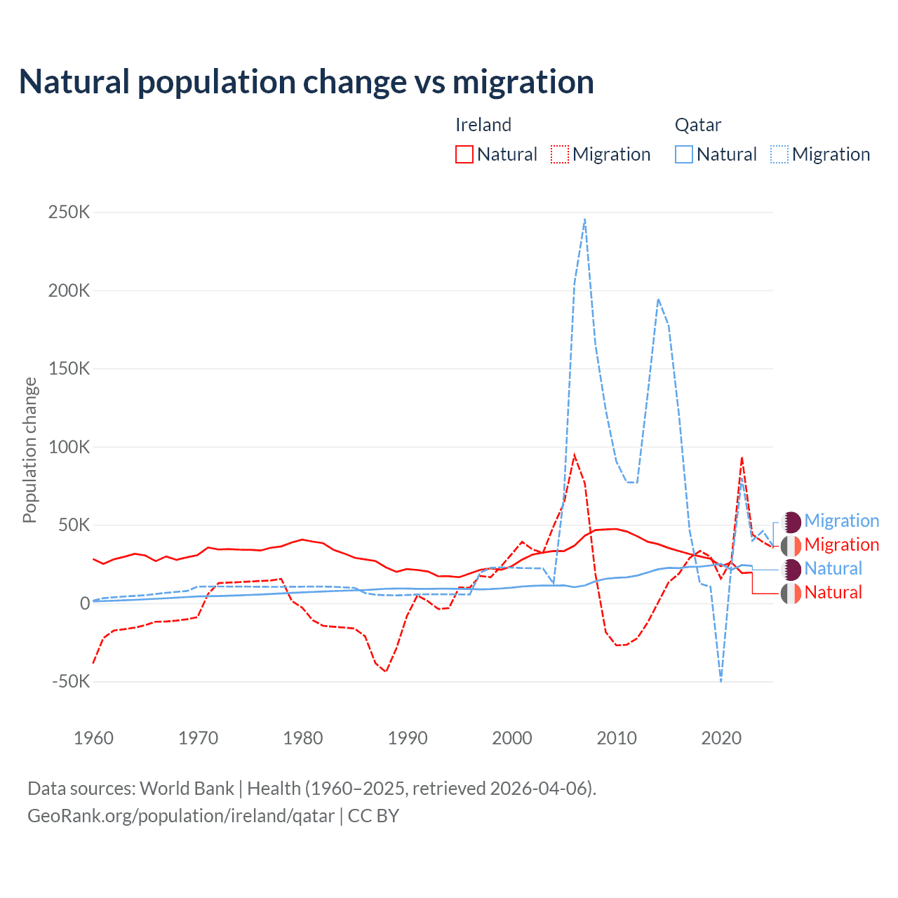 Over the last 10 years, 48.2% of the population change in Ireland is from natural causes (a gain of 284,644 people) and 51.8% is from migration (a gain of 305,297 people). In Qatar 26.1% is from natural causes (a gain of 232,009 people) and 73.9% is from migration (a gain of 655,712 people).