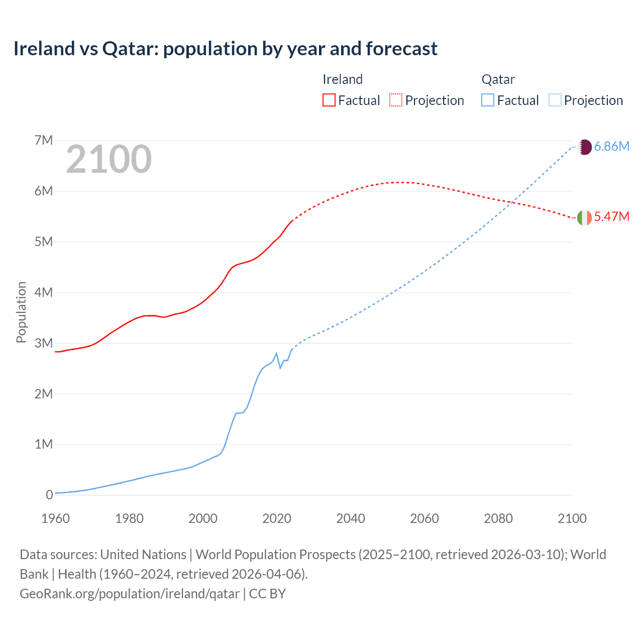 The latest officially reported population of Ireland was 5,395,790 in 2024 vs 2,857,822 people in Qatar in 2024. In 2026, based on the adjusted UN estimation, the current Ireland's population is 5,518,360 people compared to 2,999,260 in Qatar.