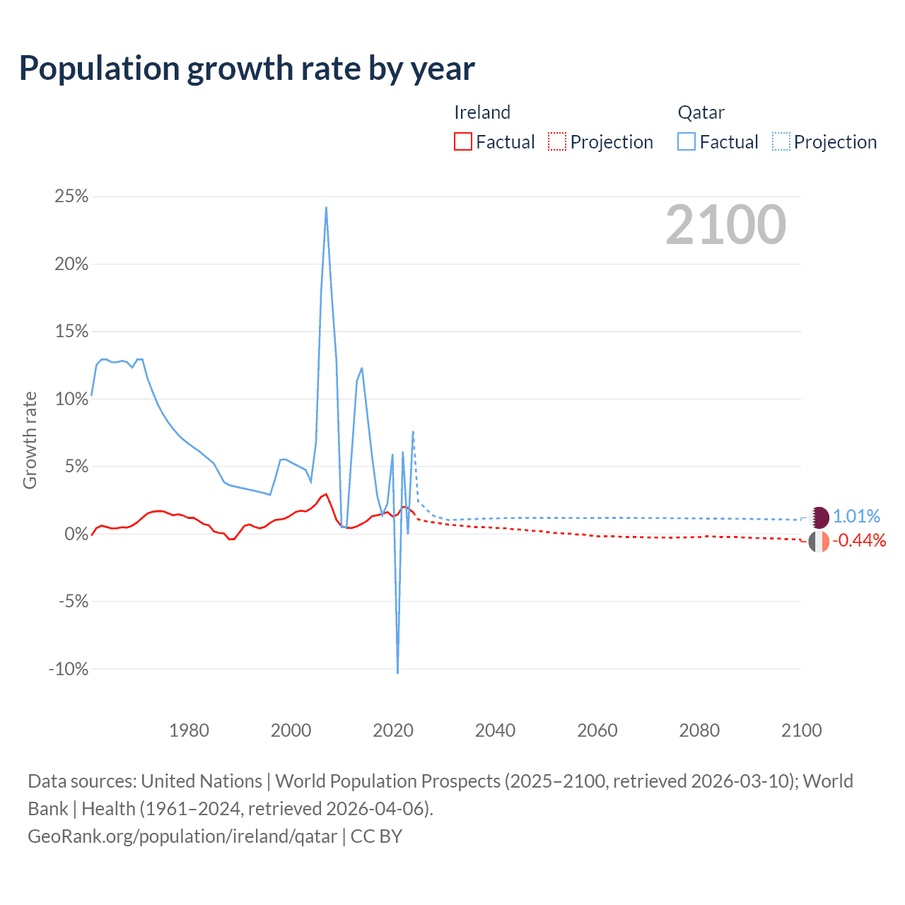 - For the last 10 years, Ireland has had an average growth rate of +1.41% per year vs +3.86% in Qatar.