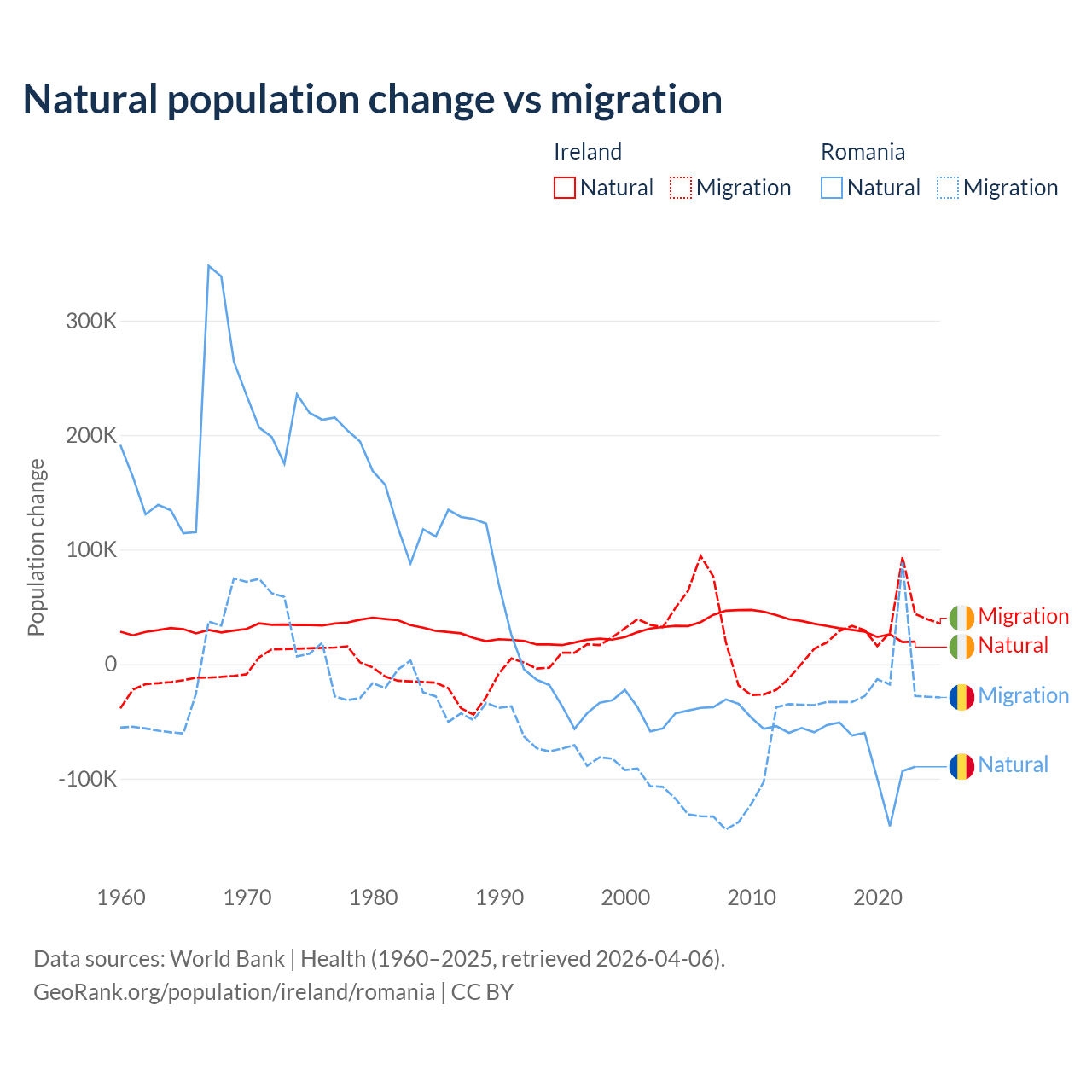 Over the last 10 years, 48.2% of the population change in Ireland is from natural causes (a gain of 284,644 people) and 51.8% is from migration (a gain of 305,297 people). In Romania 82% is from natural causes (a loss of 766,295 people) and 18% is from migration (a loss of 167,917 people).