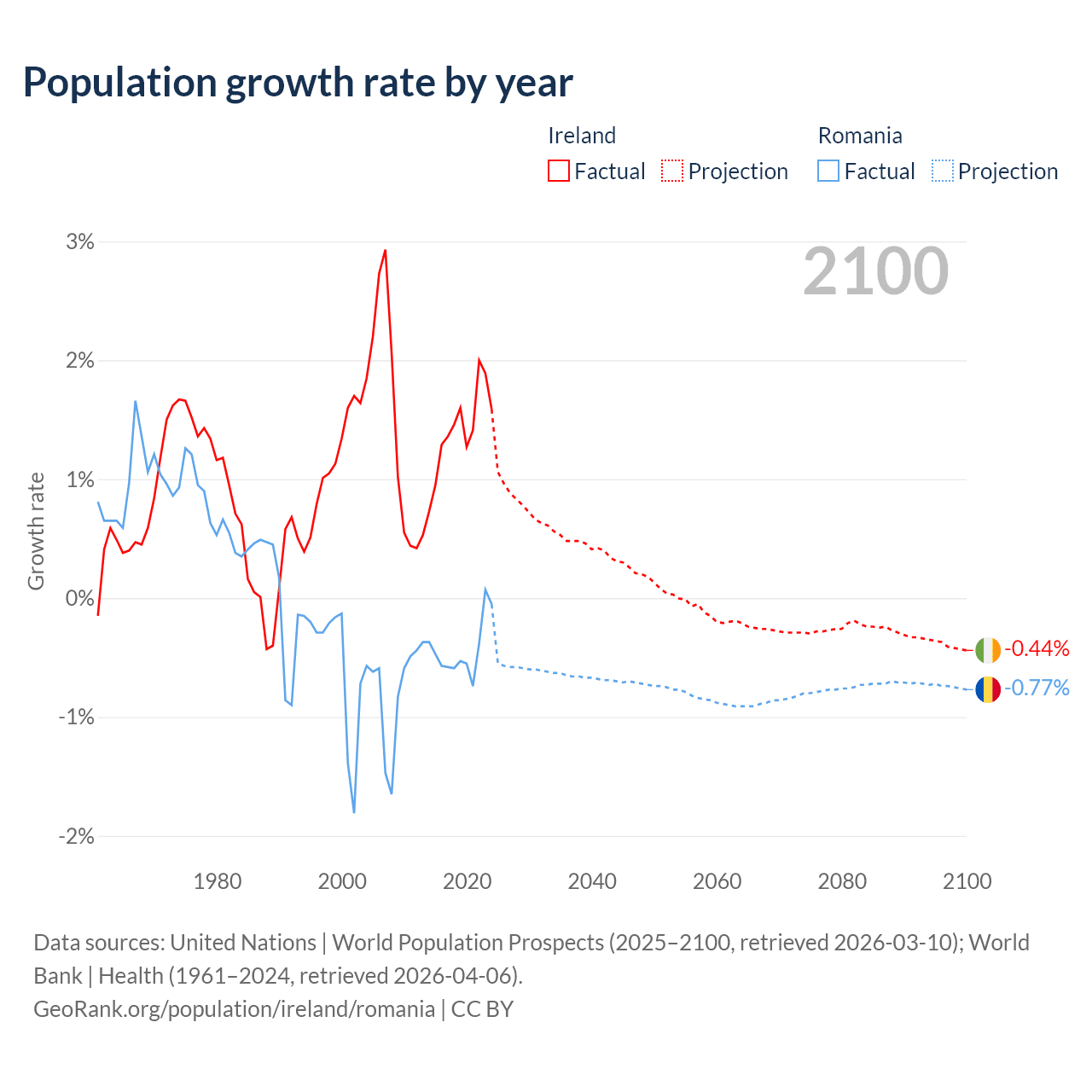 - For the last 10 years, Ireland has had an average growth rate of +1.41% per year vs -0.43% in Romania.