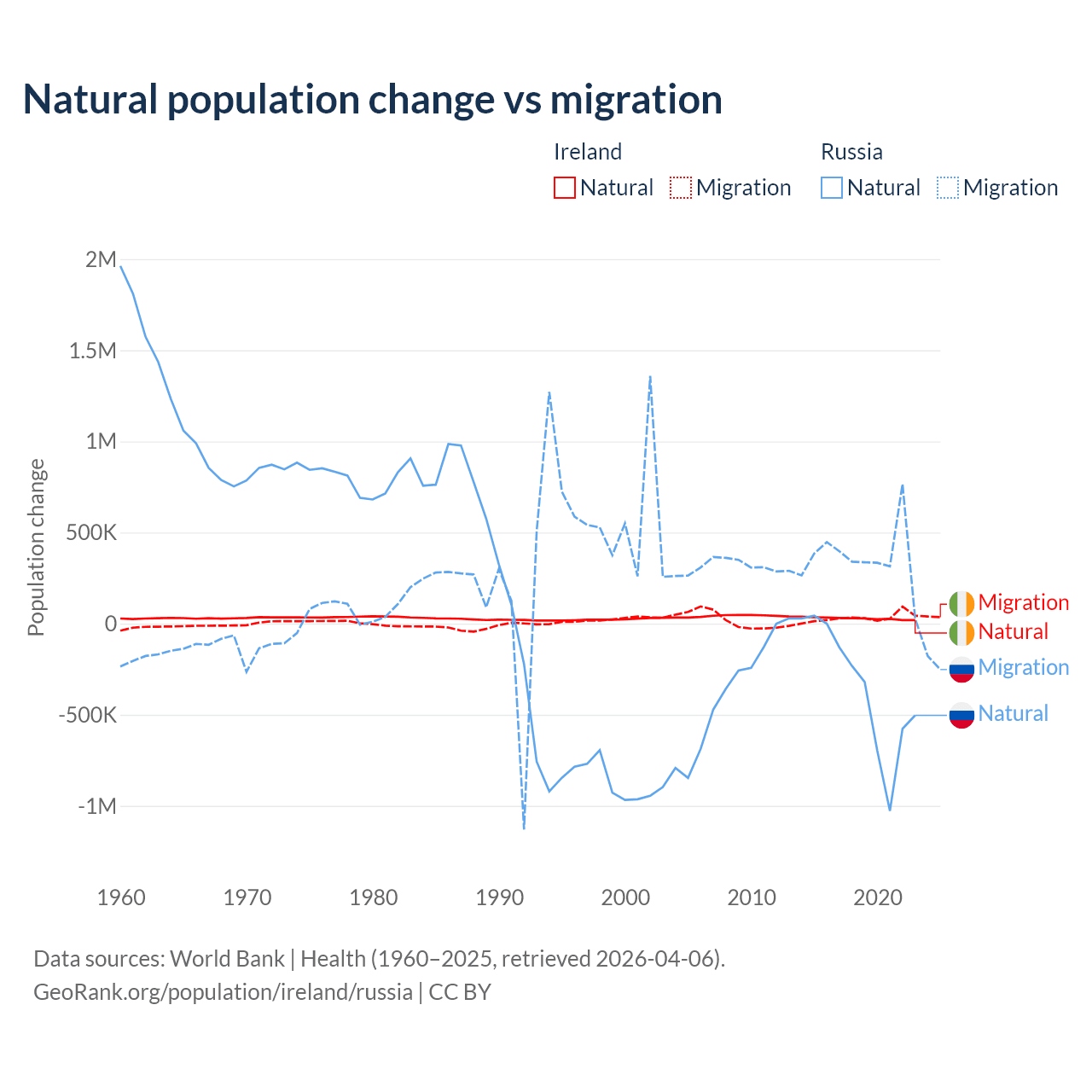 Over the last 10 years, 48.2% of the population change in Ireland is from natural causes (a gain of 284,644 people) and 51.8% is from migration (a gain of 305,297 people). In Russia 48.6% is from natural causes (a loss of 3,416,377 people) and 51.4% is from migration (a gain of 3,611,826 people).