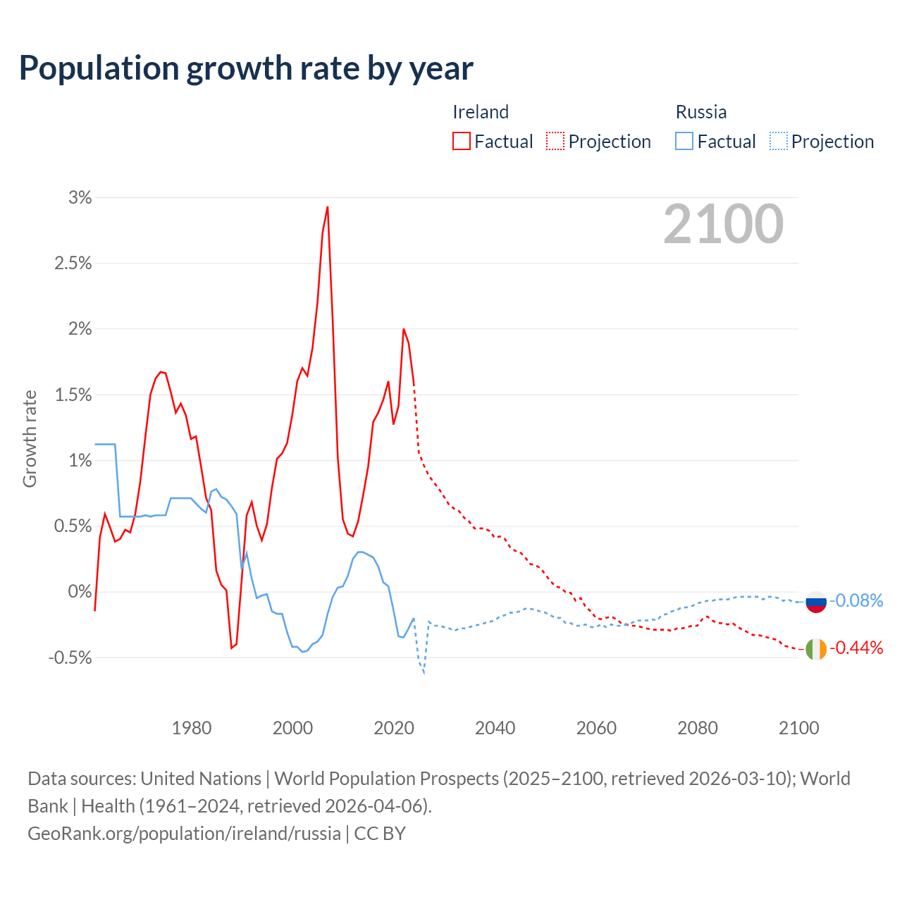 - For the last 10 years, Ireland has had an average growth rate of +1.41% per year vs -0.02% in Russia.