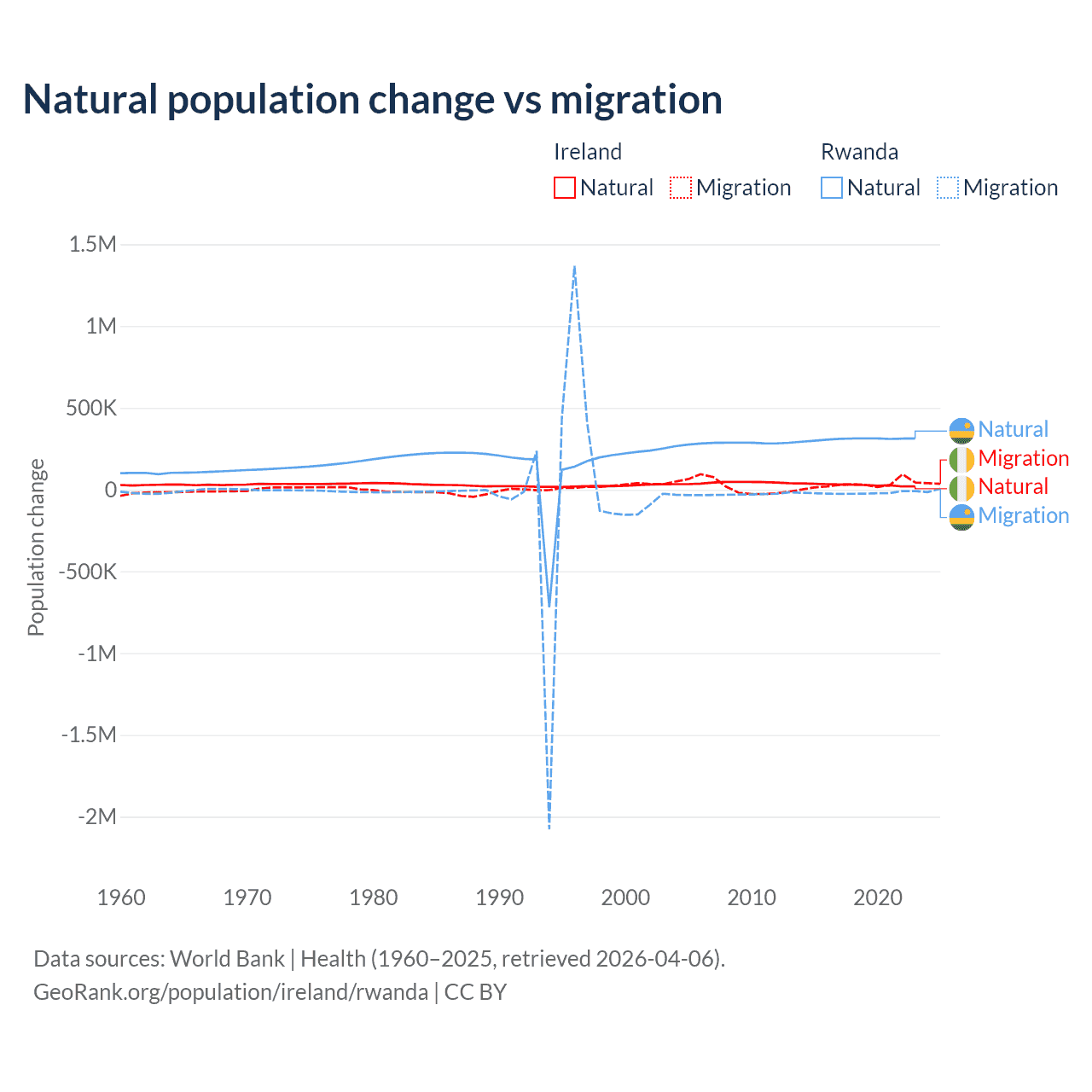Over the last 10 years, 48.2% of the population change in Ireland is from natural causes (a gain of 284,644 people) and 51.8% is from migration (a gain of 305,297 people). In Rwanda 93.8% is from natural causes (a gain of 3,081,296 people) and 6.18% is from migration (a loss of 203,035 people).