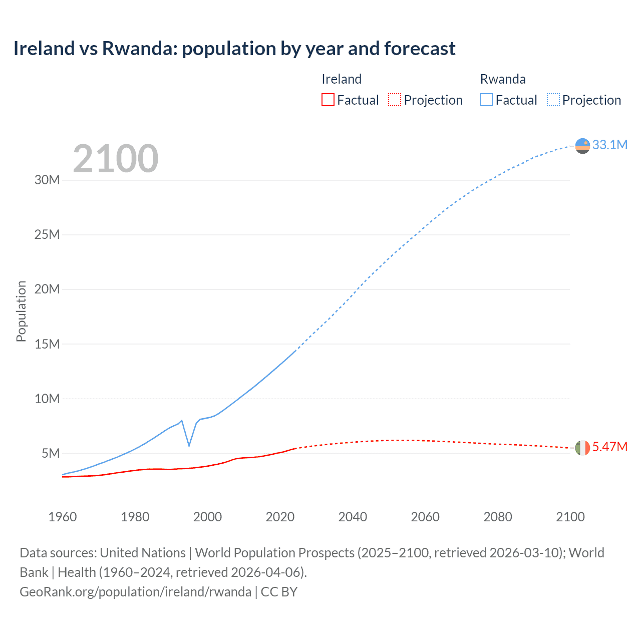 Ireland vs Rwanda: population by year and forecast