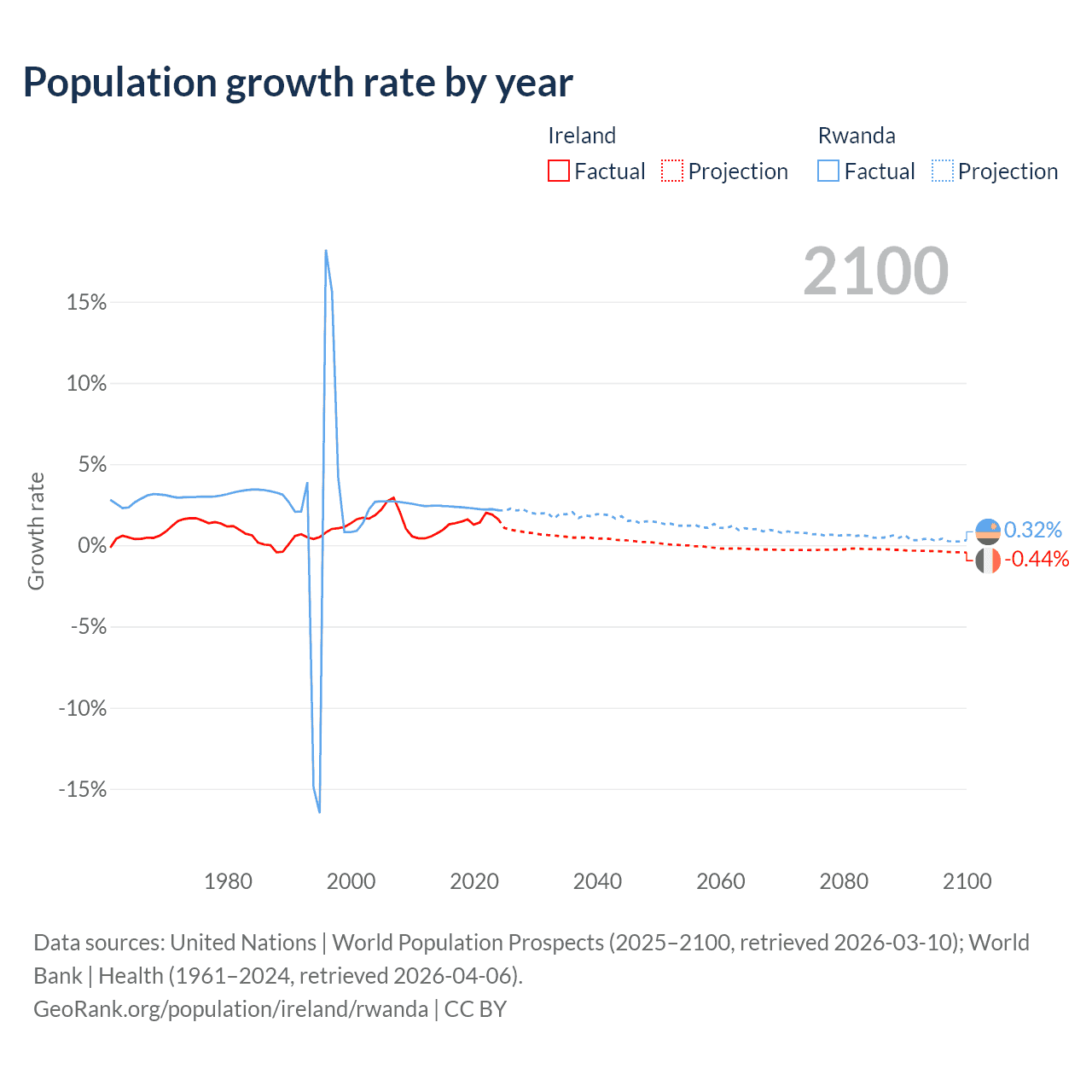 - For the last 10 years, Ireland has had an average growth rate of +1.41% per year vs +2.31% in Rwanda.