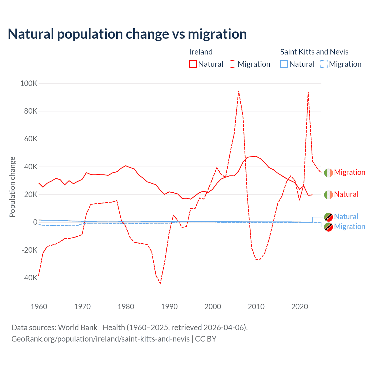 Over the last 10 years, 48.2% of the population change in Ireland is from natural causes (a gain of 284,644 people) and 51.8% is from migration (a gain of 305,297 people). In Saint Kitts and Nevis 44.9% is from natural causes (a gain of 1,225 people) and 55.1% is from migration (a loss of 1,506 people).